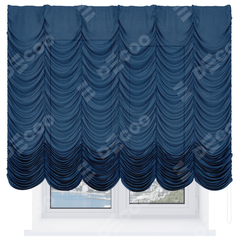 Французская штора производителя «Cortin», используется для проёма, пошита из ткани лён синий, артикул ткани 104496. Имеет универсальный механизм и подходит для монтажа: на потолок и на стену.