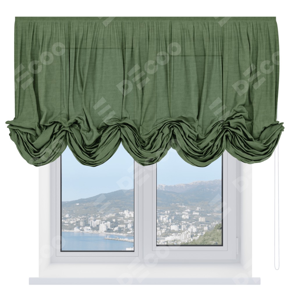 Австрийская штора производителя «Cortin», используется для проёма, пошита из ткани лён зелёный, артикул ткани 131547. Имеет универсальный механизм и подходит для монтажа: на потолок и на стену.
