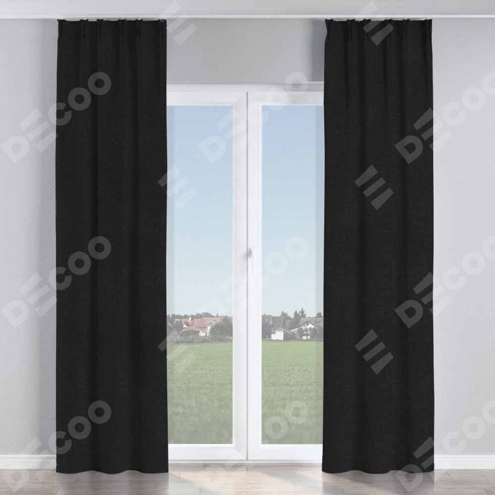 Комплект прямых штор, от производителя «Cortin», пошиты из ткани лён черный, артикул ткани 140815. С изнаночной стороны в верхней части штор пристрачивается шторная лента с декоративными складками «Кустик». Для создания элегантных складок рекомендуемый коэффициент 1:2 (на 100 см. ширины проёма 200 см. ширины ткани). Важно! Ширина штор указана без учёта коэффициента сборки!