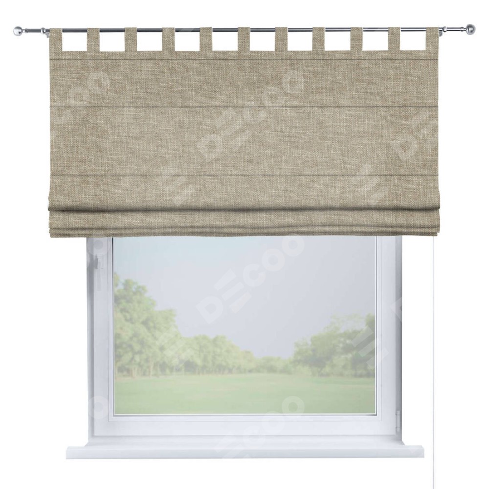 Римская штора производителя «Cortin», используется для проёма, пошита из ткани лён бежевый, артикул ткани 143839. Данная модель пошита на петлях, комплектуется на выбор круглым карнизом и подходит для монтажа на стену. Римская штора на петлях имеет простую систему регулировки высоты, отличительным преимуществом данной модели является простой способ монтажа. Достаточно повесить ее на трубу и штора готова!