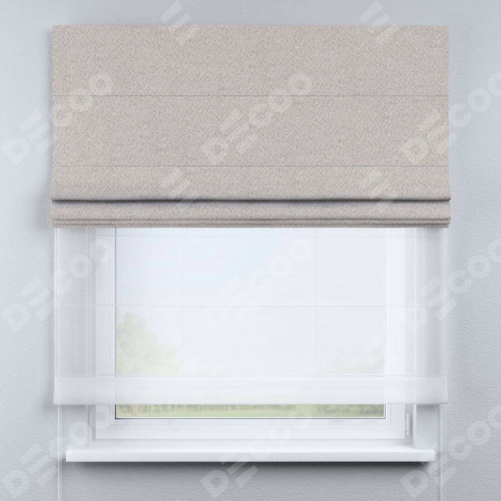 Двойная римская штора «День-ночь» от производителя Cortin предназначена для использования в проёмах. Эта штора уникальна тем, что состоит из двух полотен. На лицевой стороне находится лён димаут бежевый (артикул: 01), обеспечивающий эффективное затемнение. В комплект также входит вторая ткань — легкий белый тюль (артикул: V-01), который добавляет изящества и легкости оформлению окна. Кроме того, доступны и другие разновидности ткани тюль, выбор которых доступен по  ссылке .