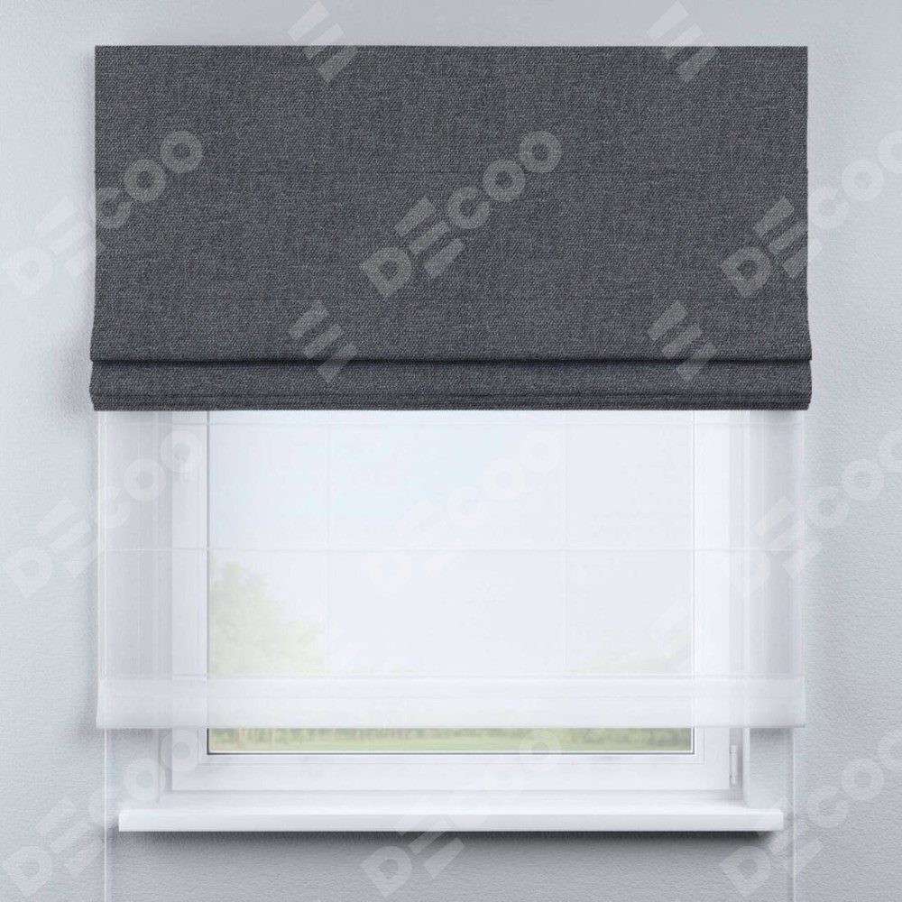 Двойная римская штора «День-ночь» от производителя Cortin предназначена для использования в проёмах. Эта штора уникальна тем, что состоит из двух полотен. На лицевой стороне находится лён димаут графит (артикул: 140644), обеспечивающий эффективное затемнение. В комплект также входит вторая ткань — легкий белый тюль (артикул: V-01), который добавляет изящества и легкости оформлению окна. Кроме того, доступны и другие разновидности ткани тюль, выбор которых доступен по  ссылке .