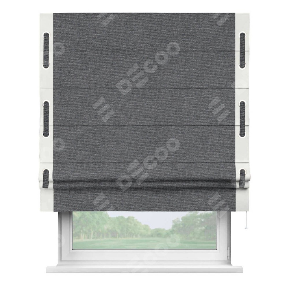 Римская штора «Кортин» для проёма, лён димаут графит с кантом Стрим Дуо (люверсы с пояском)