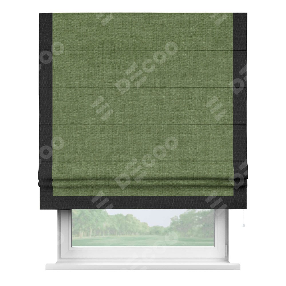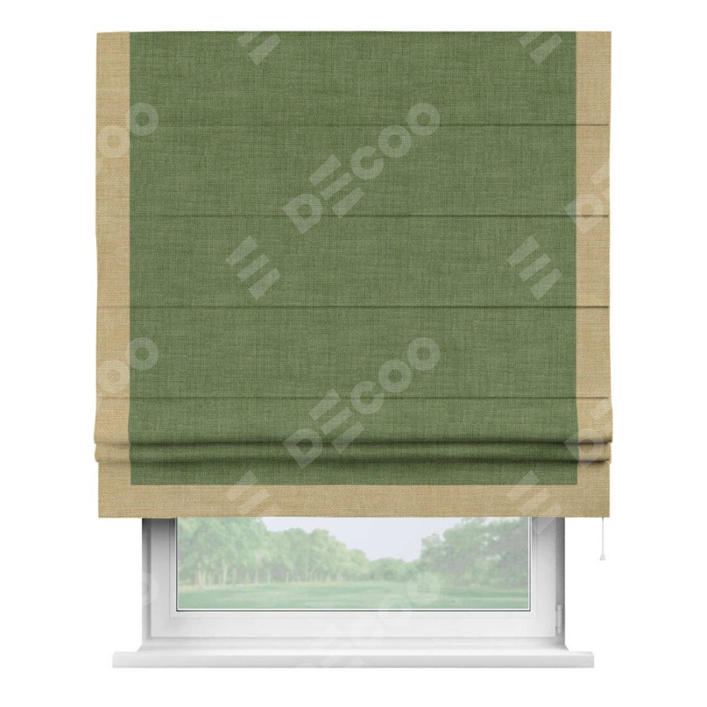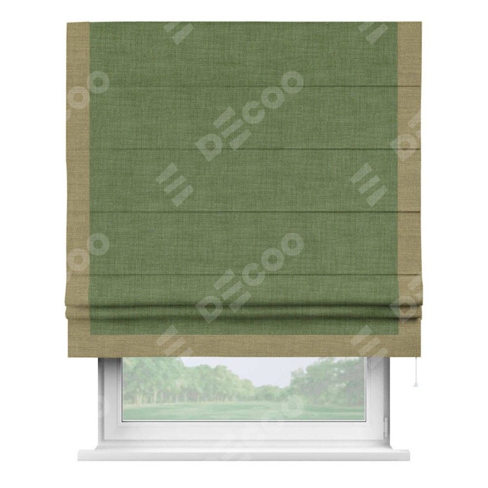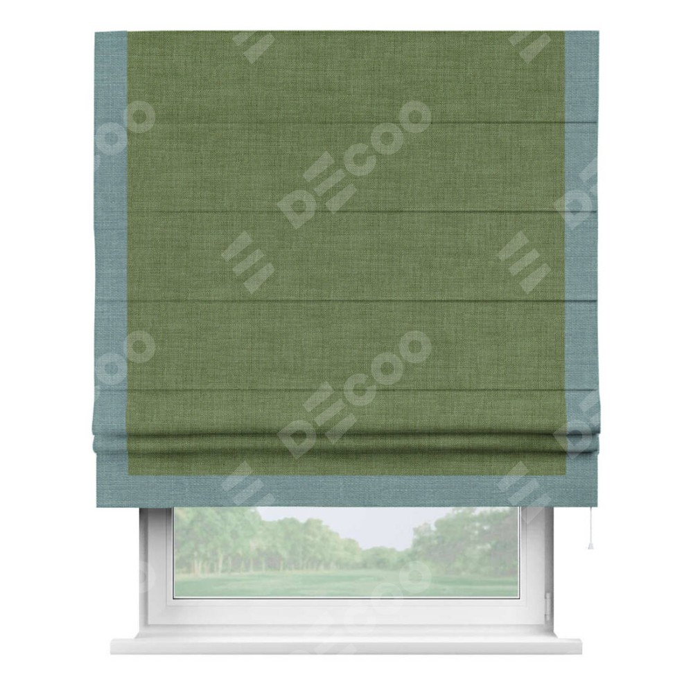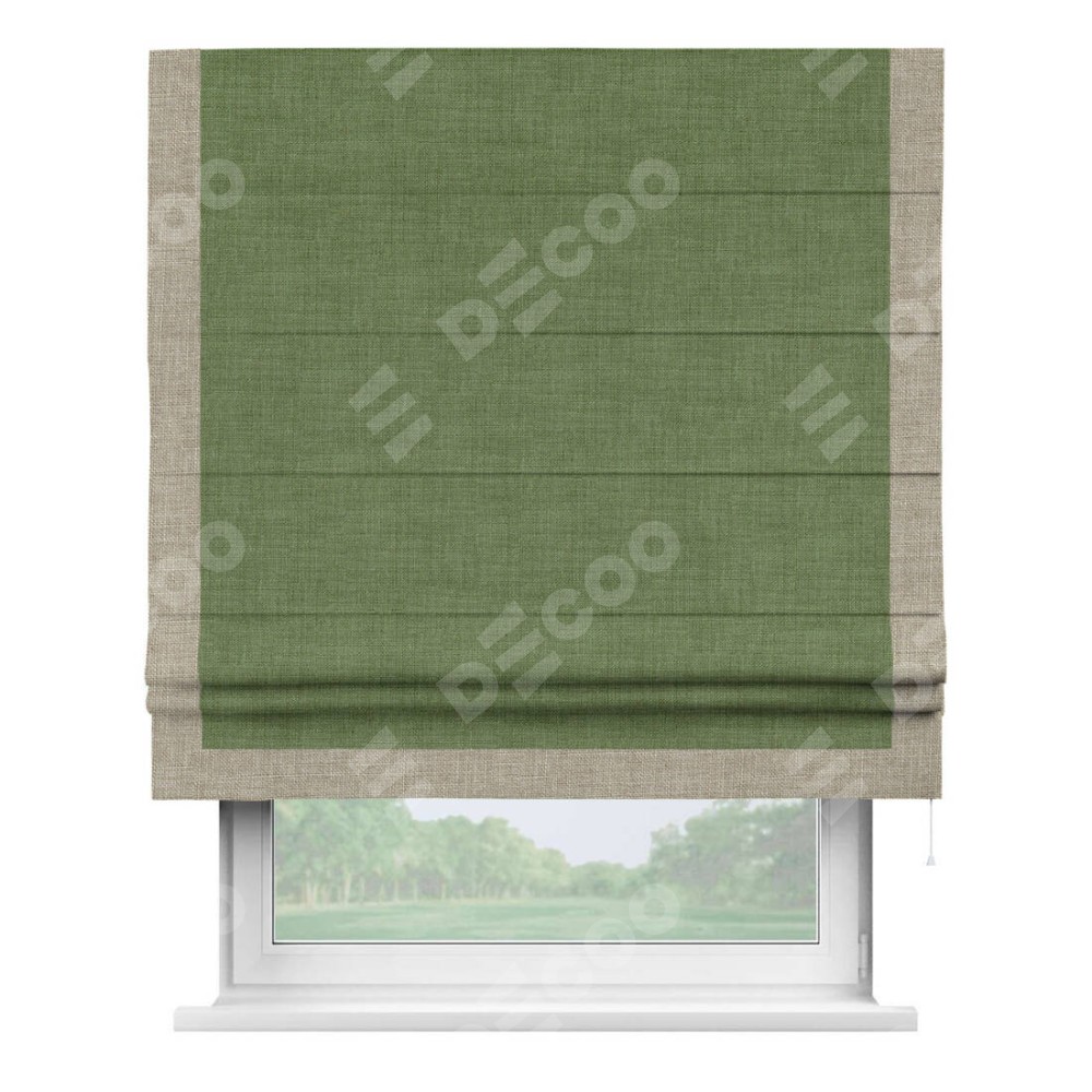Классическая римская штора производителя «Cortin», пошита из ткани лён зелёный, артикул: 131547. Имеет универсальный механизм и подходит для монтажа: на потолок, на стену и в нишу.