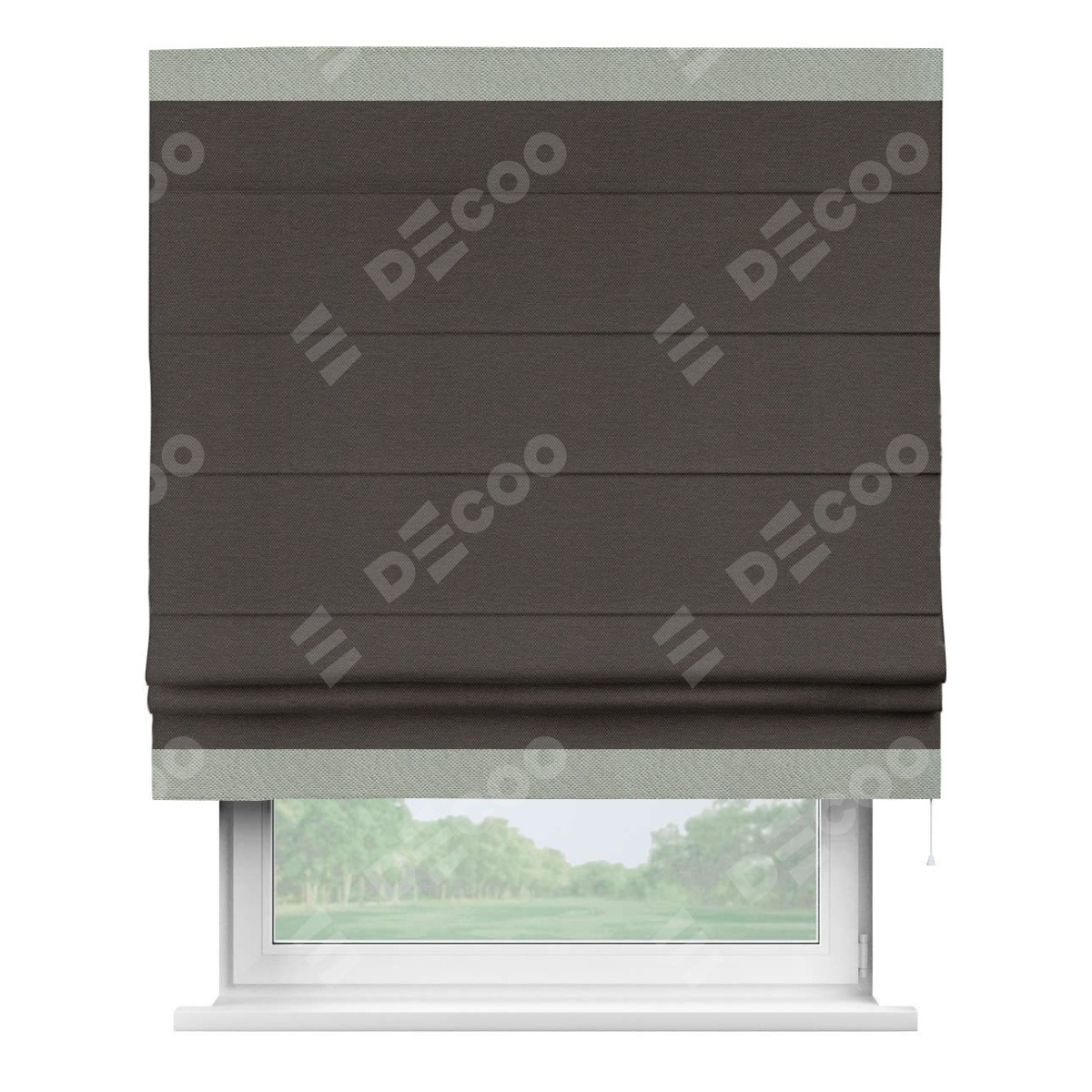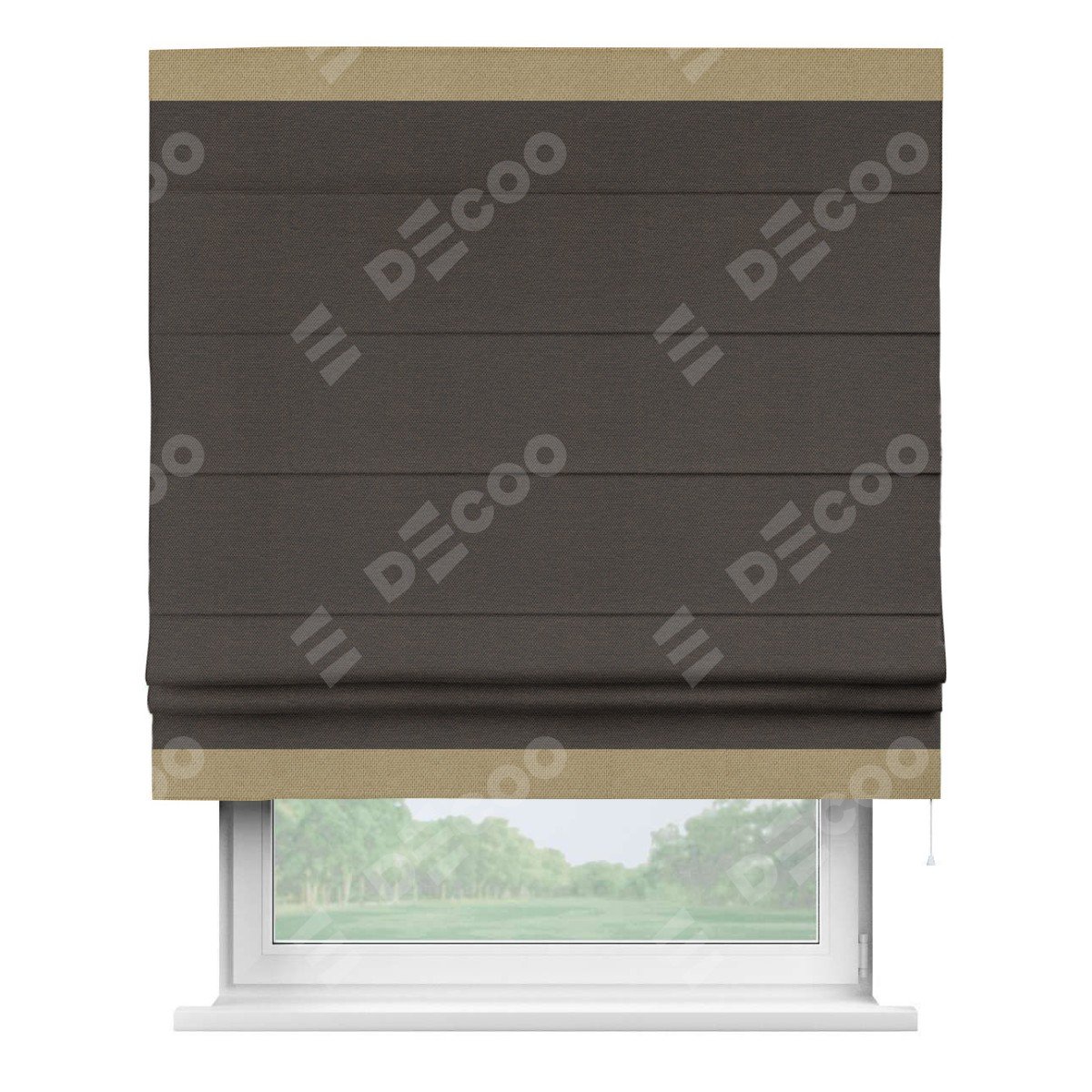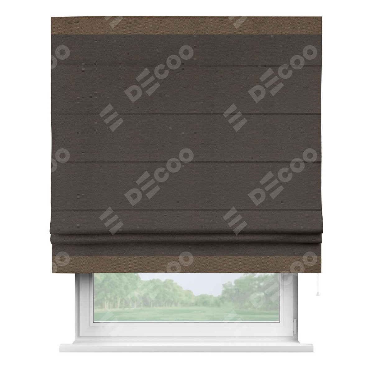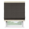 Римская штора производителя «Cortin», используется для проёма, пошита из ткани лён димаут венге, артикул 85410. Отделка шторы кантом «Горизонт», ткань для канта используется из льна димаут разной расцветки на выбор. Имеет универсальный механизм и подходит для монтажа: на потолок, на стену и в нишу.