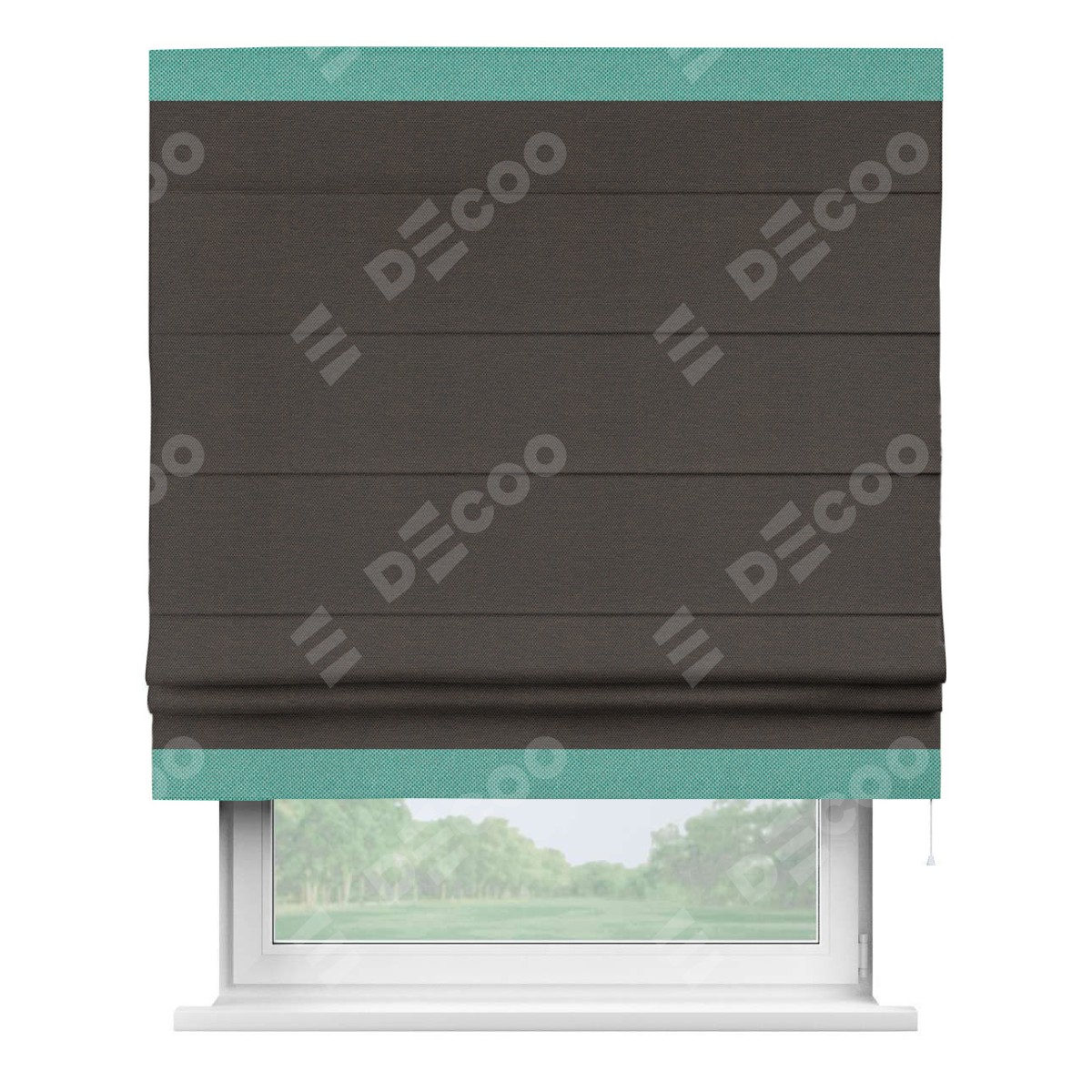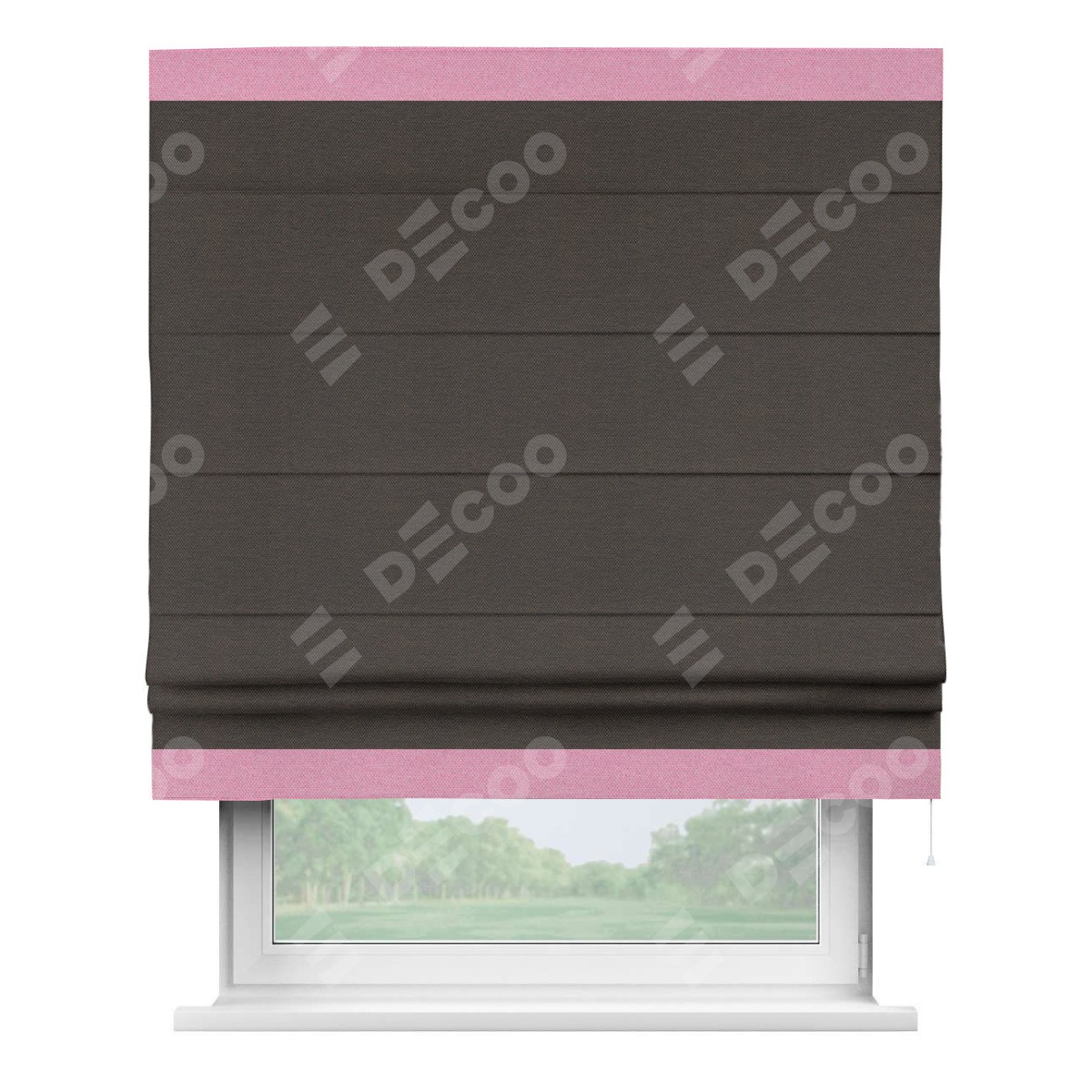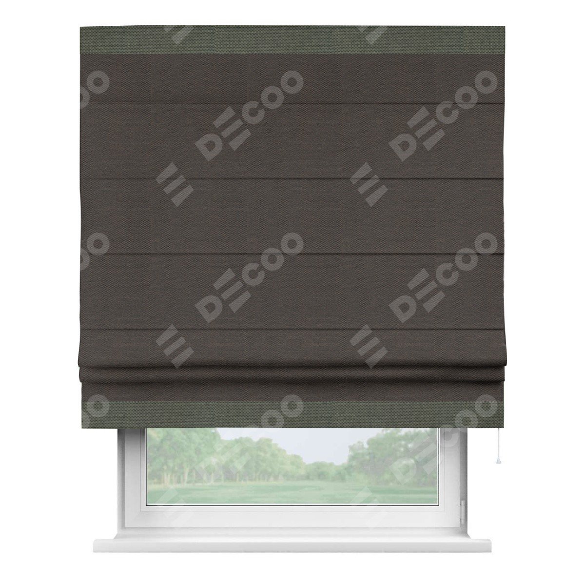 Римская штора производителя «Cortin», используется для проёма, пошита из ткани лён димаут венге, артикул 85410. Отделка шторы кантом «Горизонт», ткань для канта используется из льна димаут разной расцветки на выбор. Имеет универсальный механизм и подходит для монтажа: на потолок, на стену и в нишу.