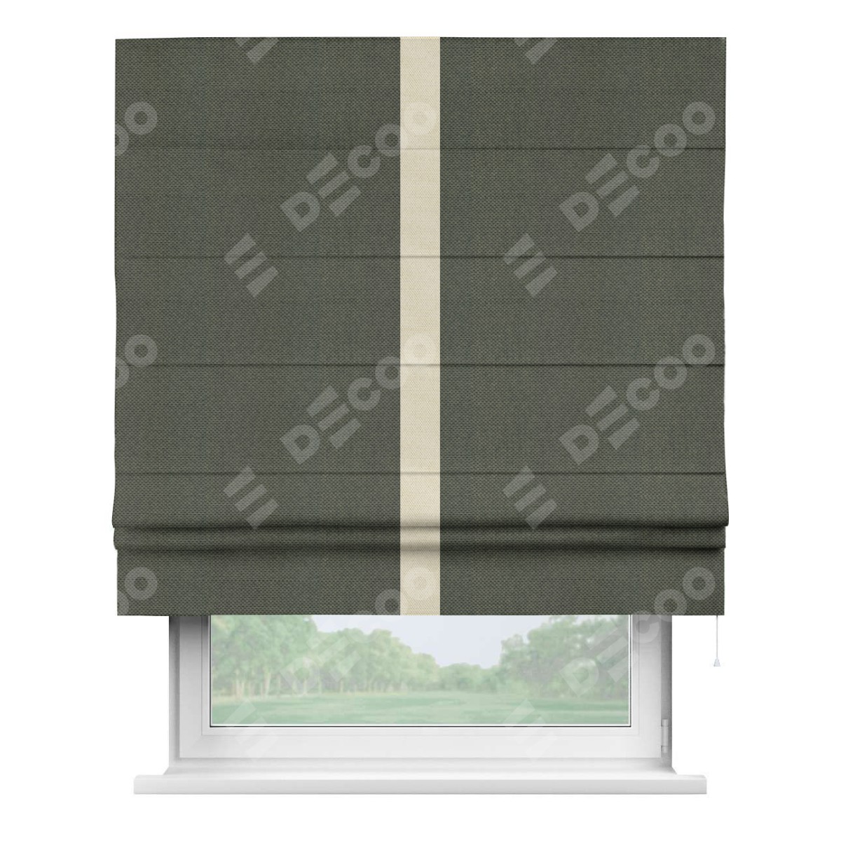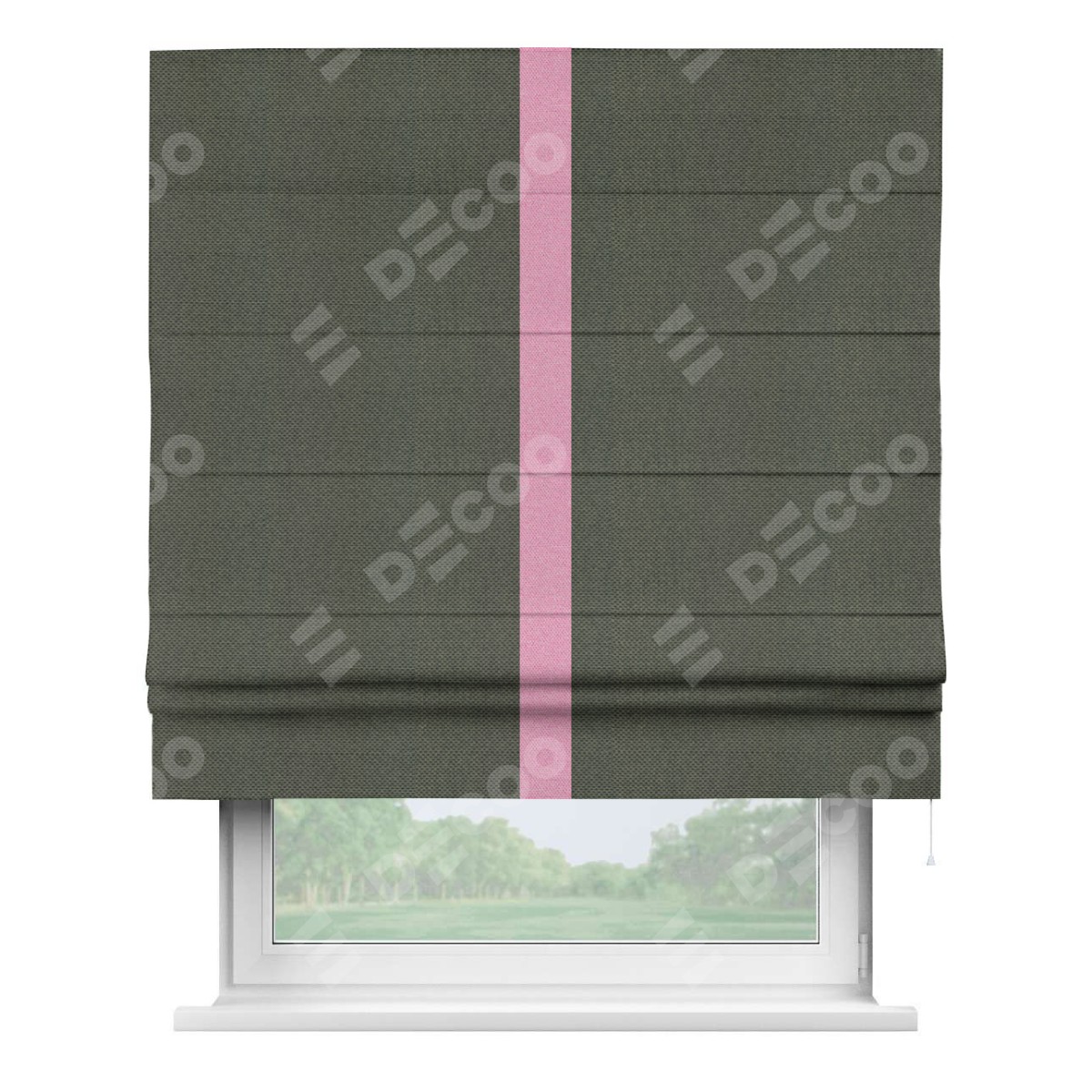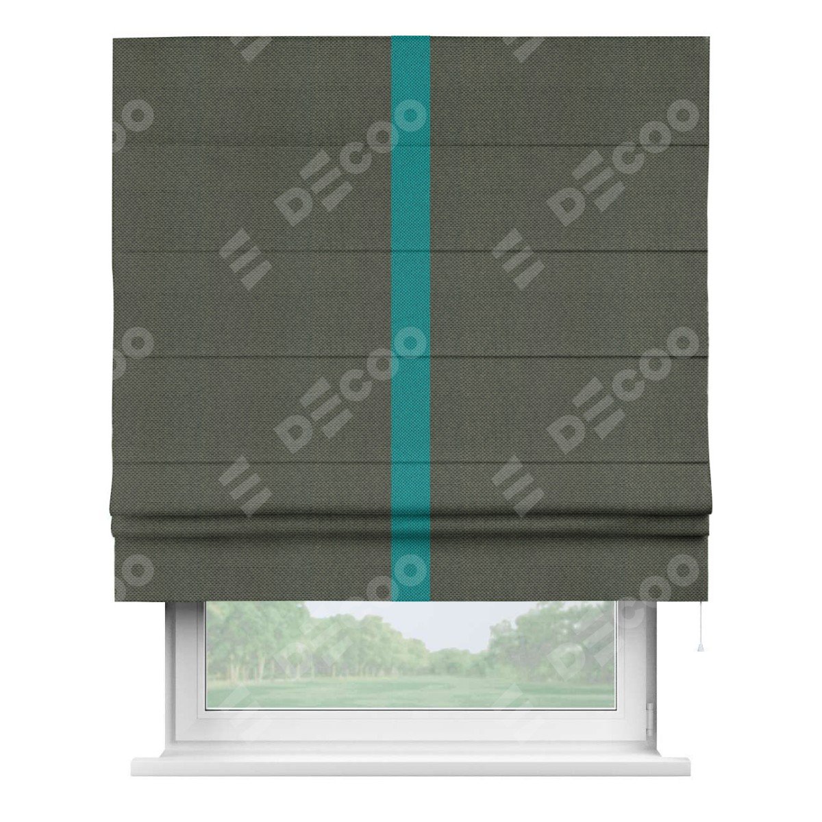 Римская штора производителя «Cortin», используется для проёма, пошита из ткани лён димаут графит, артикул 27. Отделка шторы кантом «Хайвэй», ткань для канта используется из льна димаут разной расцветки на выбор. Имеет универсальный механизм и подходит для монтажа: на потолок, на стену и в нишу.