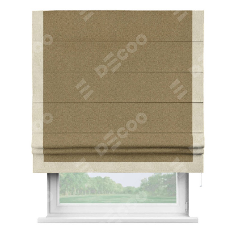 Римская штора производителя «Cortin», используется для проёма, пошита из ткани лён димаут оливковый, артикул 16243. Отделка шторы кантом «Виктория», ткань для канта используется из льна димаут разной расцветки на выбор. Имеет универсальный механизм и подходит для монтажа: на потолок, на стену и в нишу.