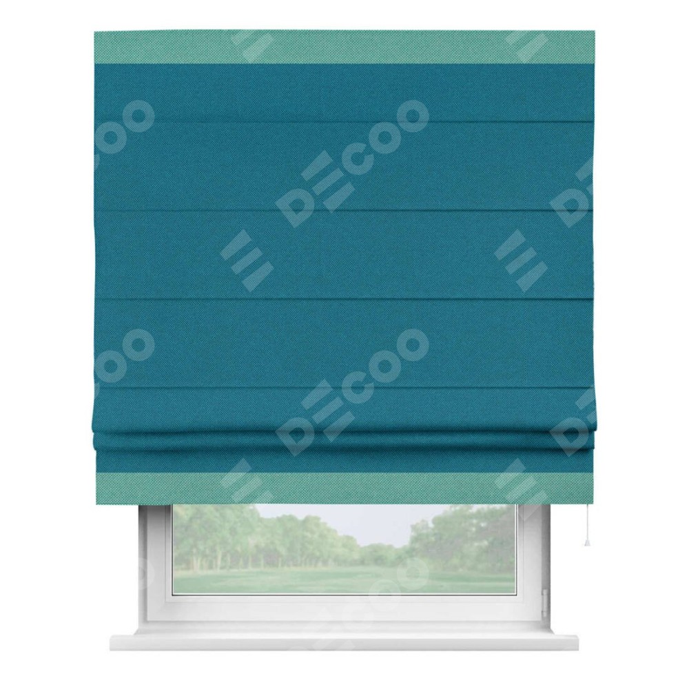 Римская штора производителя «Cortin», используется для проёма, пошита из ткани лён димаут светло-синий, артикул 02. Отделка шторы кантом «Горизонт», ткань для канта используется из льна димаут разной расцветки на выбор. Имеет универсальный механизм и подходит для монтажа: на потолок, на стену и в нишу.