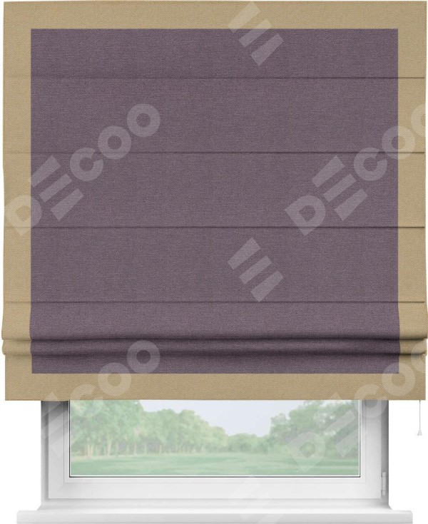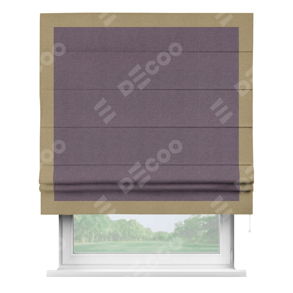 Римская штора производителя «Cortin», используется для проёма, пошита из ткани лён димаут светло-фиолетовый, артикул 83034. Отделка шторы кантом «Чесс», ткань для канта используется из льна димаут разной расцветки на выбор. Имеет универсальный механизм и подходит для монтажа: на потолок, на стену и в нишу.