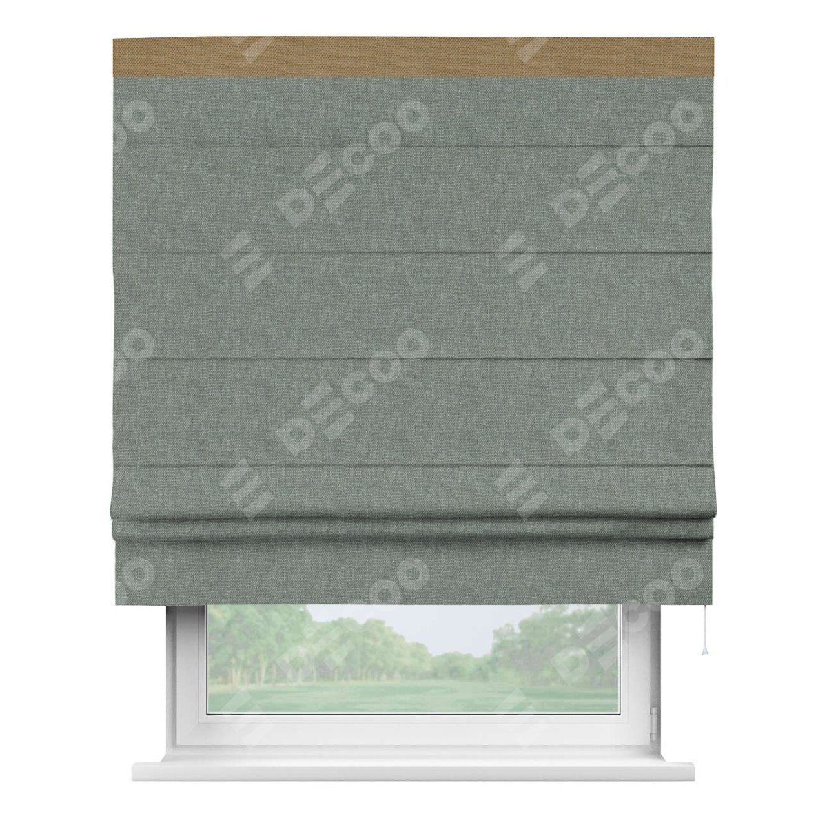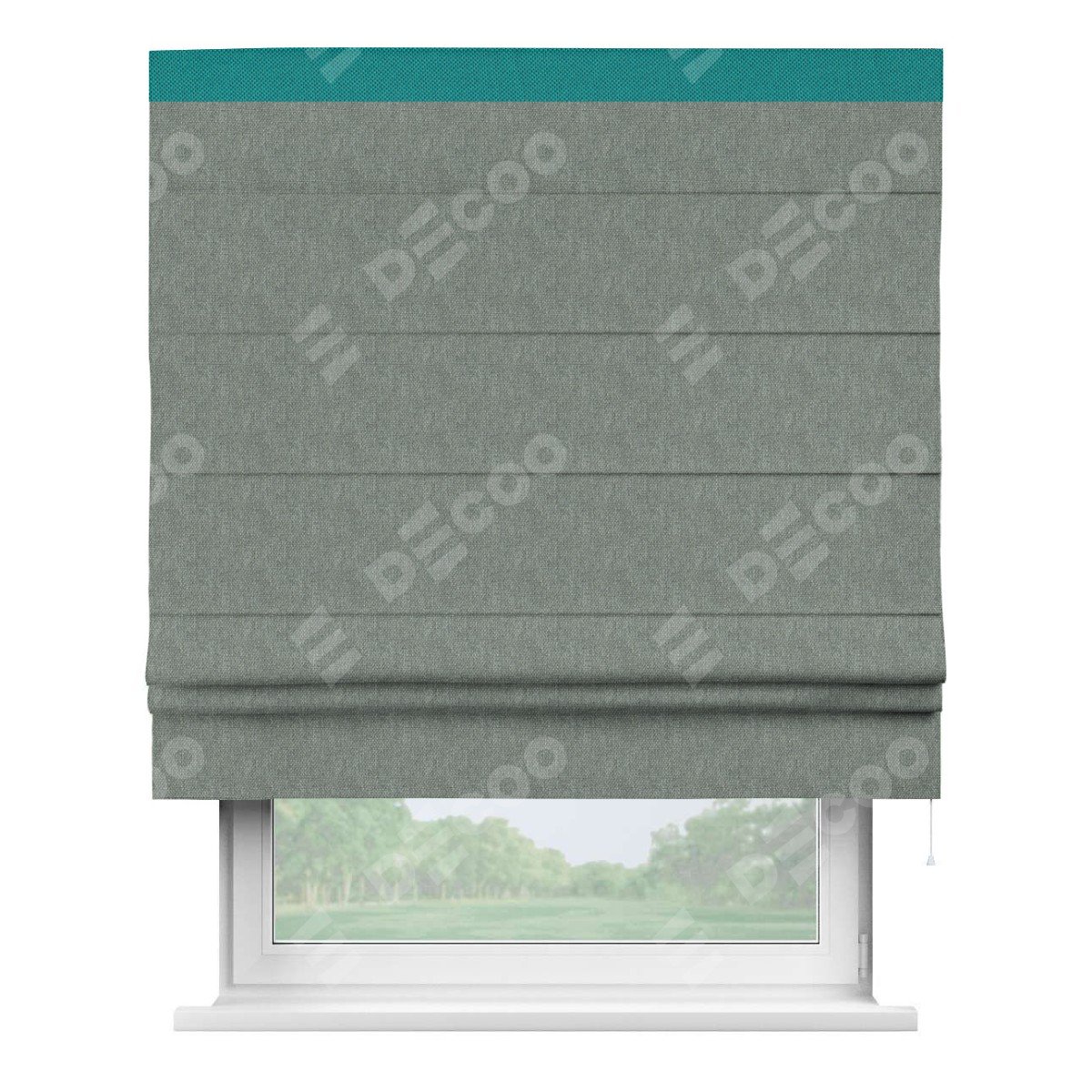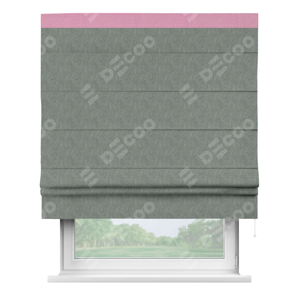 Римская штора производителя «Cortin», используется для проёма, пошита из ткани лён димаут серый, артикул 16240. Отделка шторы кантом «Кинг», ткань для канта используется из льна димаут разной расцветки на выбор. Имеет универсальный механизм и подходит для монтажа: на потолок, на стену и в нишу.