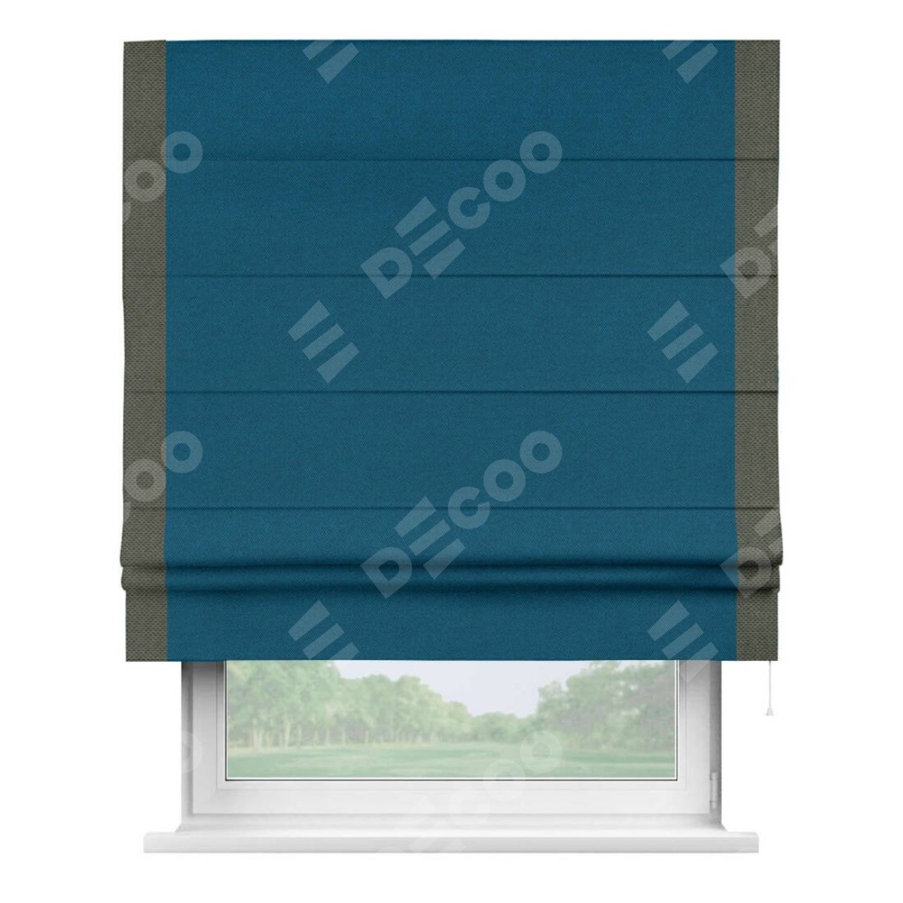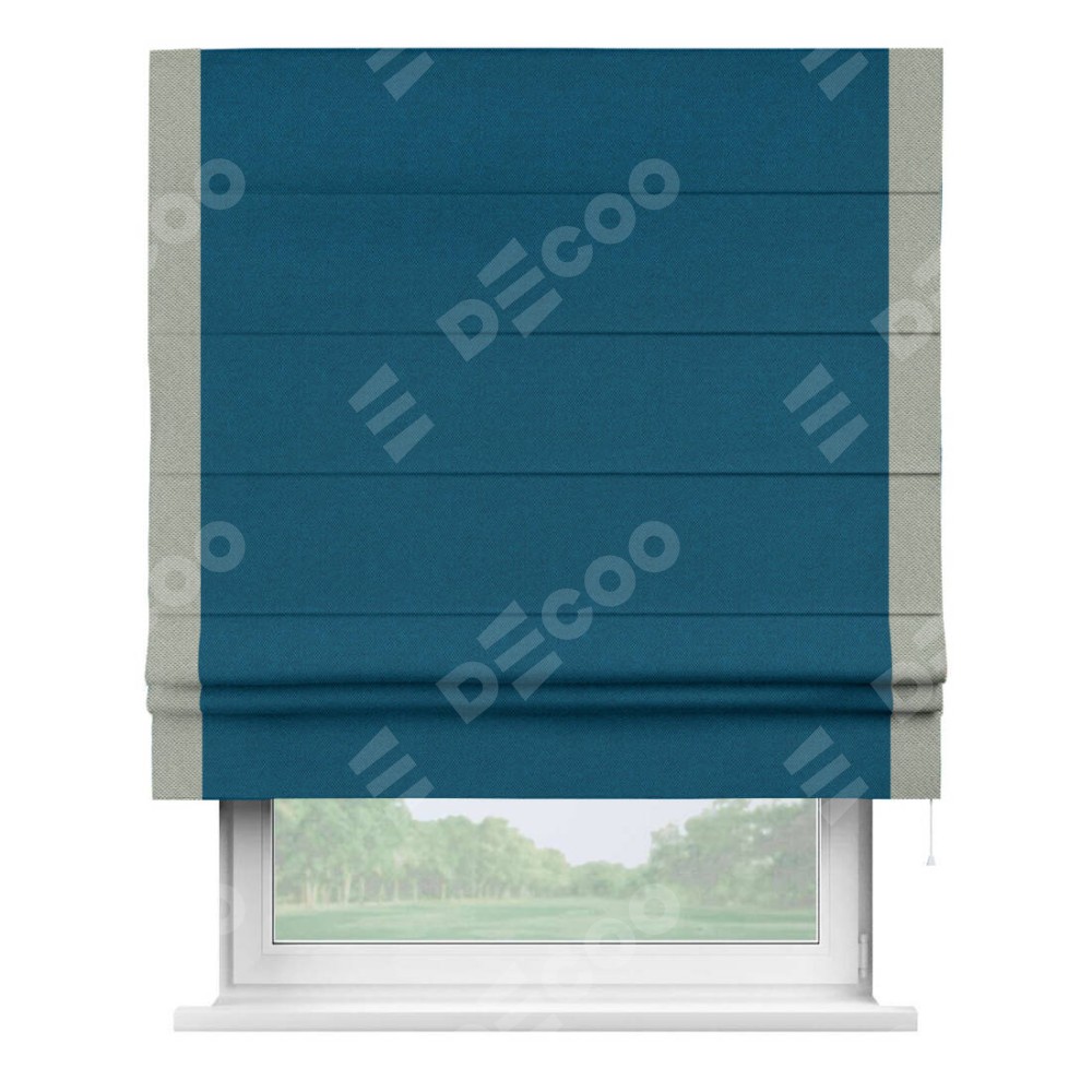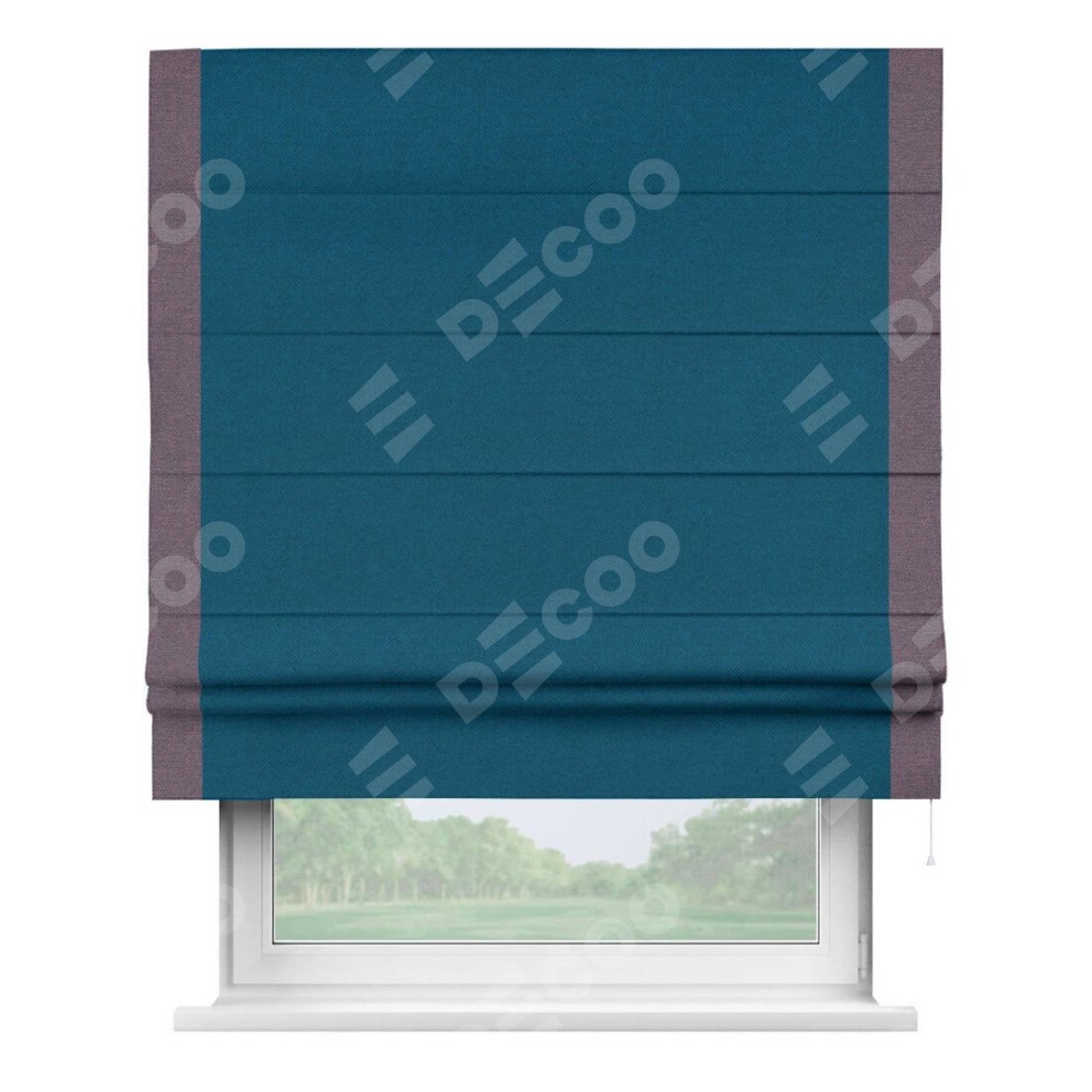 Римская штора производителя «Cortin», используется для проёма, пошита из ткани лён димаут синий, артикул 16260. Отделка шторы кантом «Стрим Дуо», ткань для канта используется из льна димаут разной расцветки на выбор. Имеет универсальный механизм и подходит для монтажа: на потолок, на стену и в нишу.