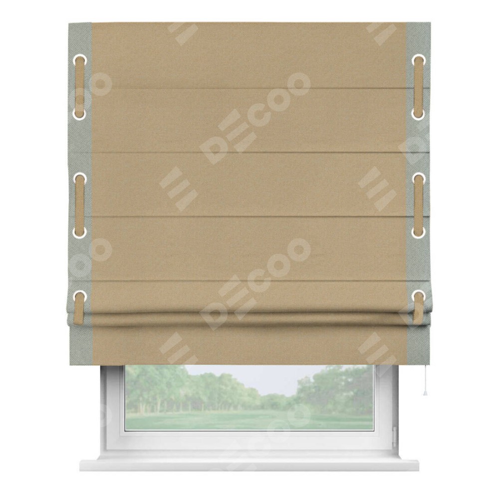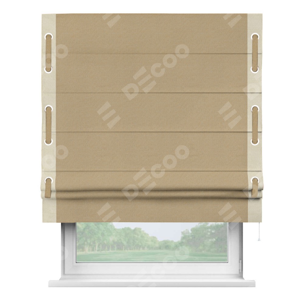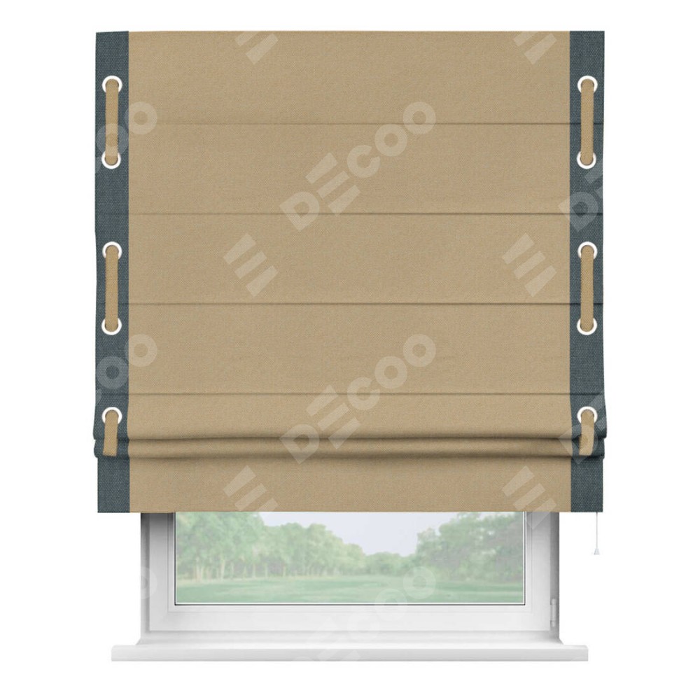 Римская штора производителя «Cortin», используется для проёма, пошита из ткани лён димаут тёмно-бежевый, артикул 83037. Отделка шторы кантом «Стрим Дуо» на кантах расположены люверсы с пояском, ткань для канта используется лён димаут разной расцветки на выбор. Ткань для пояска обычно используется из основной ткани шторы, а так же можно сделать из любой расцветки по желанию. Имеет универсальный механизм и подходит для монтажа: на потолок, на стену и в нишу.