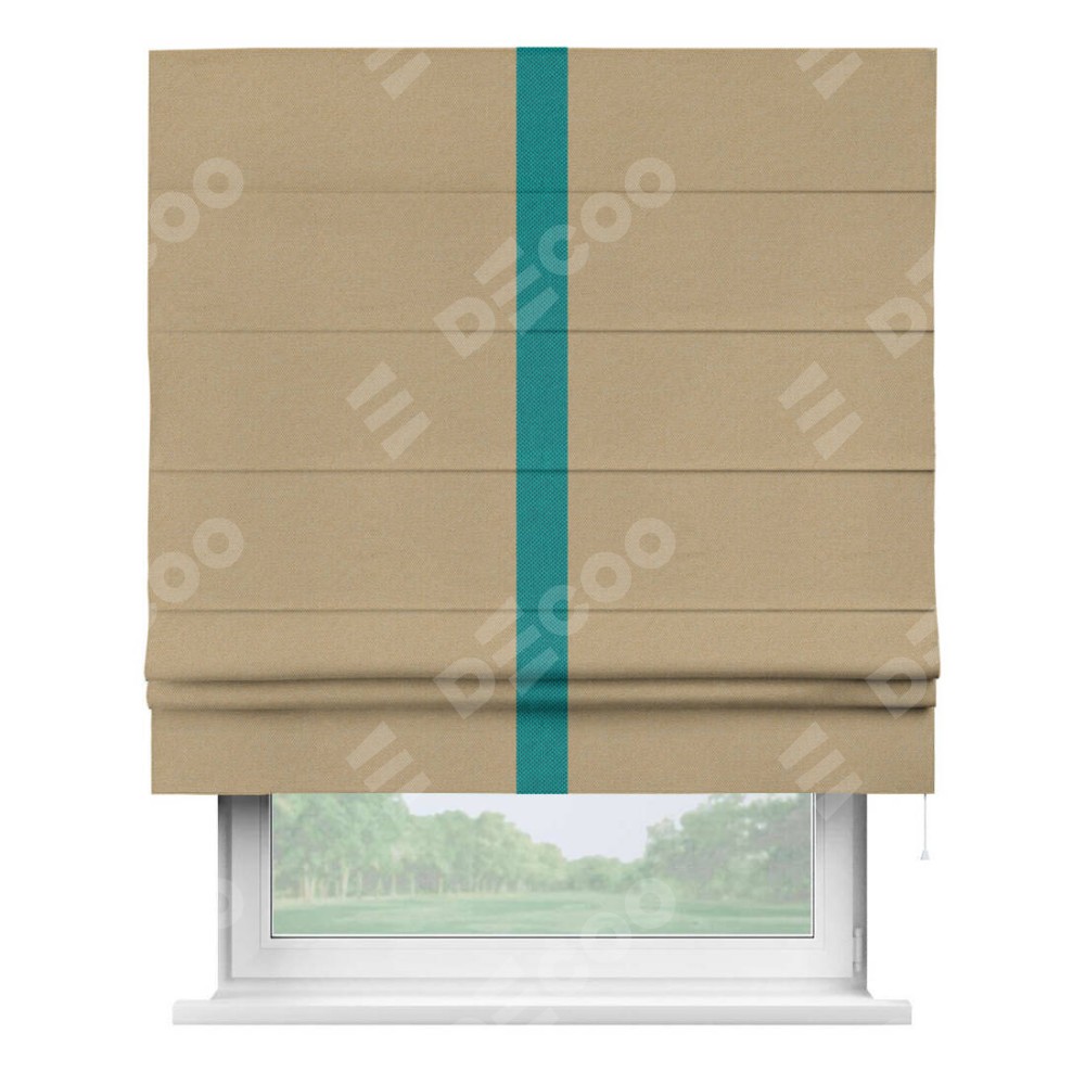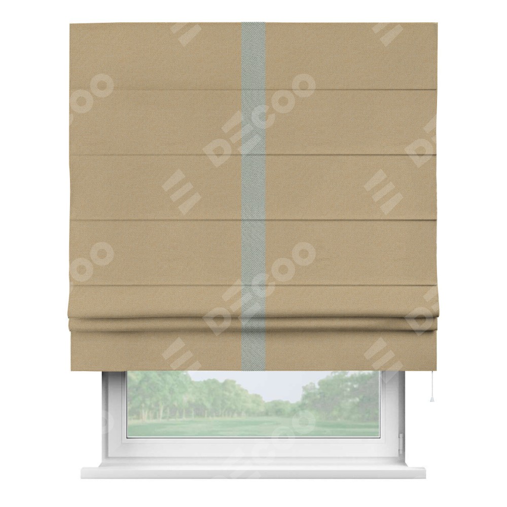 Римская штора производителя «Cortin», используется для проёма, пошита из ткани лён димаут тёмно-бежевый, артикул 83 037. Отделка шторы кантом «Хайвэй», ткань для канта используется из льна димаут разной расцветки на выбор. Имеет универсальный механизм и подходит для монтажа: на потолок, на стену и в нишу.