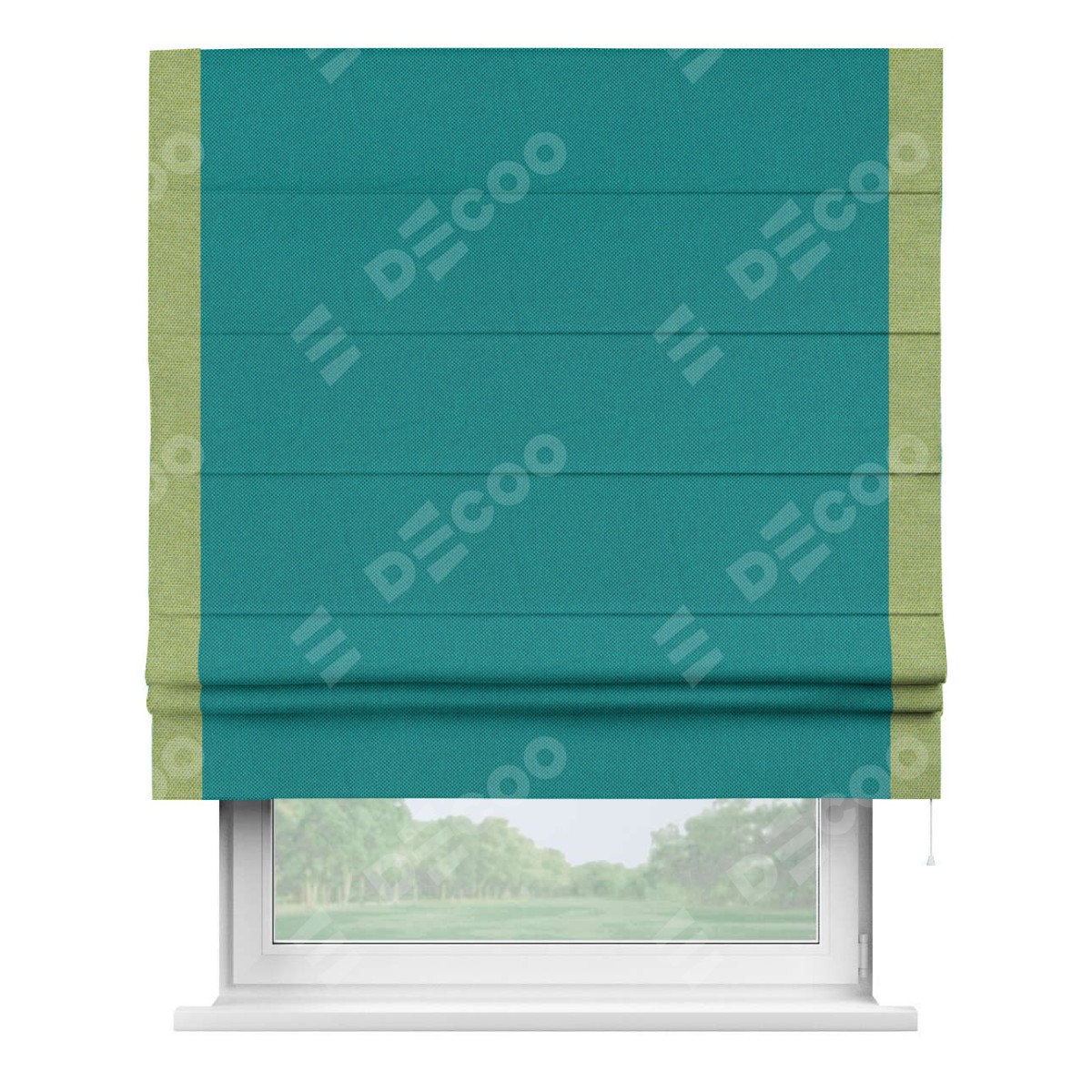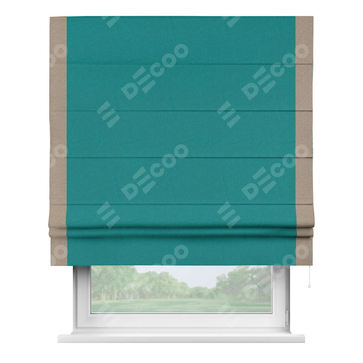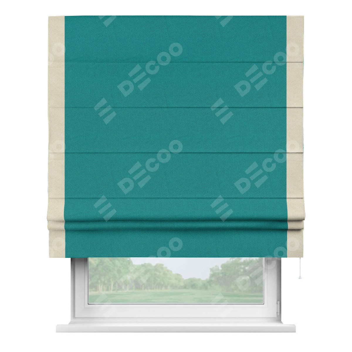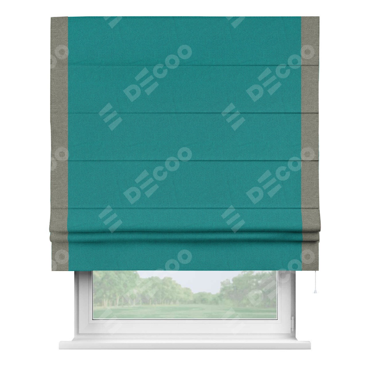 Римская штора производителя «Cortin», используется для проёма, пошита из ткани лён димаут тёмно-бирюзовый, артикул 318. Отделка шторы кантом «Стрим Дуо», ткань для канта используется из льна димаут разной расцветки на выбор. Имеет универсальный механизм и подходит для монтажа: на потолок, на стену и в нишу.