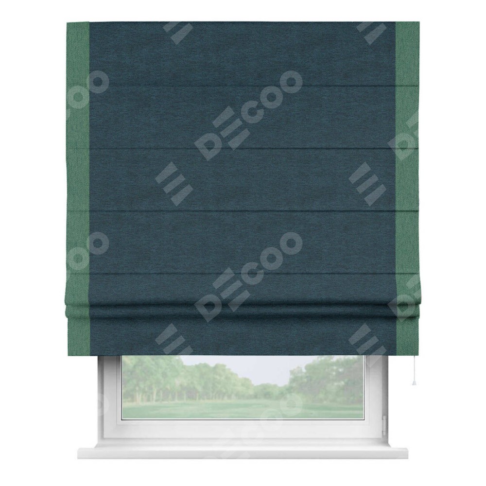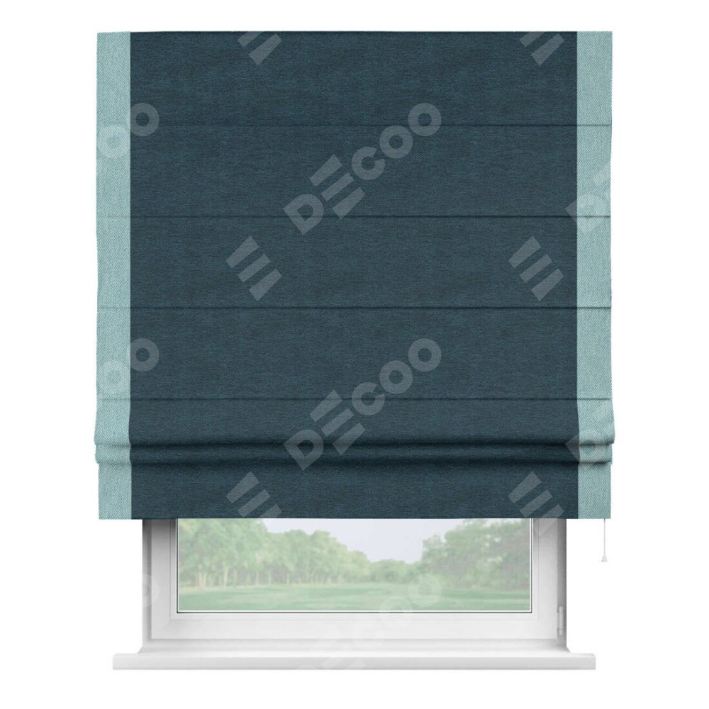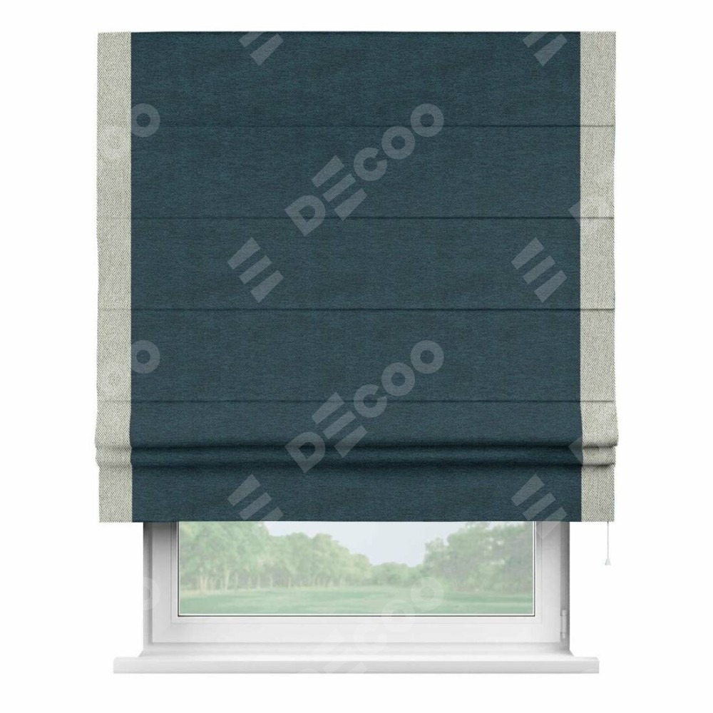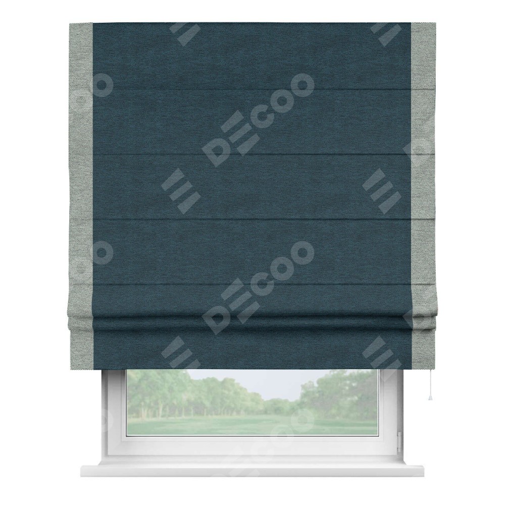 Римская штора производителя «Cortin», используется для проёма, пошита из ткани твид блэкаут глубокий синий, артикул 21590. Отделка шторы кантом «Стрим Дуо», ткань для канта используется из твида разной расцветки на выбор. Имеет универсальный механизм и подходит для монтажа: на потолок, на стену и в нишу.