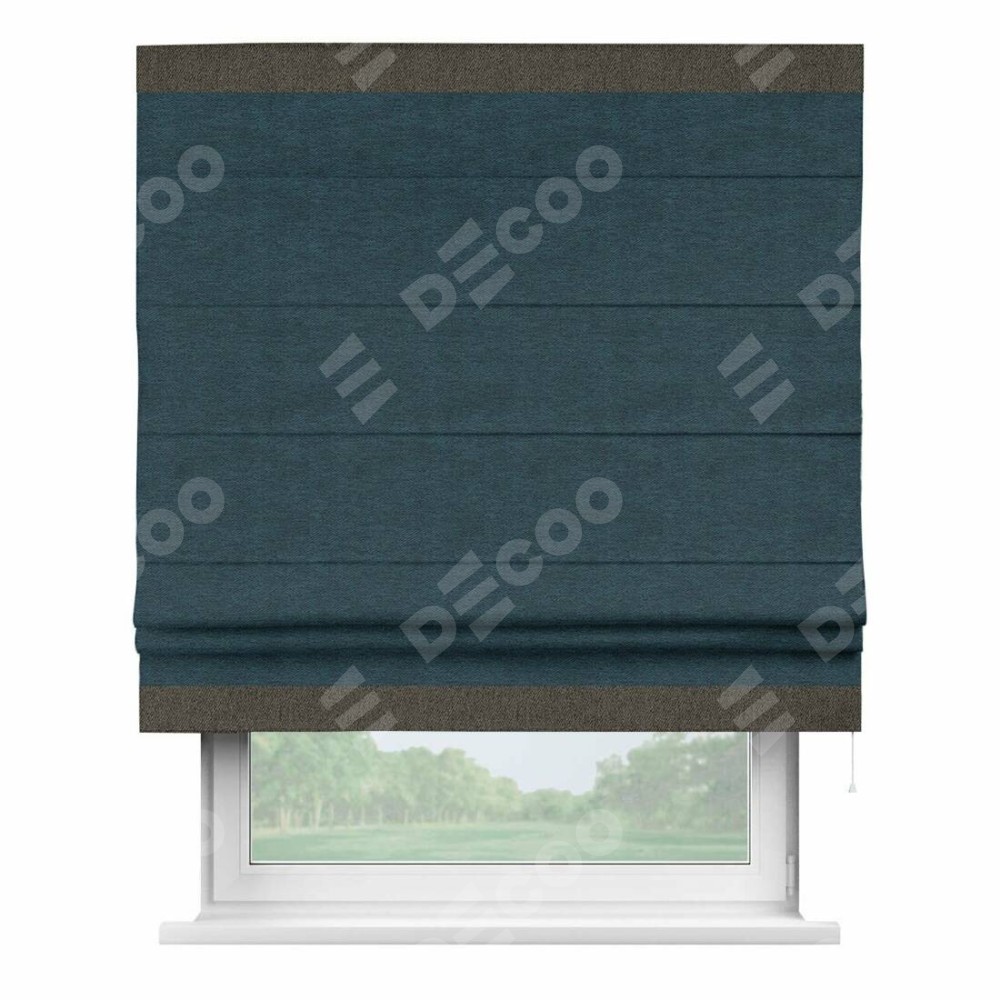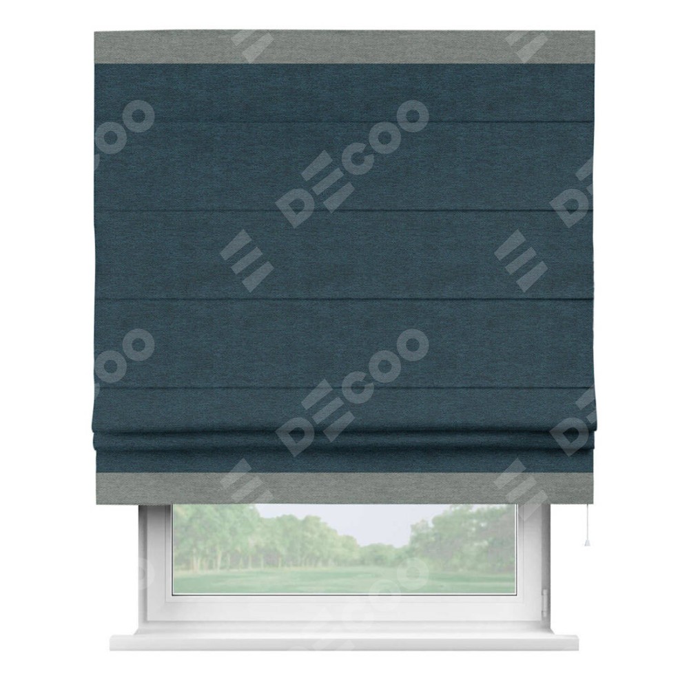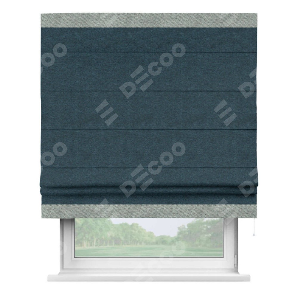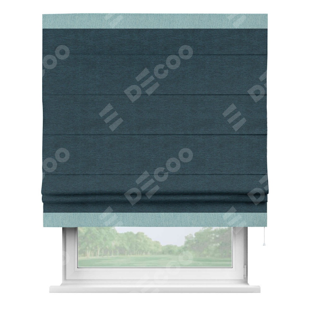 Римская штора производителя «Cortin», используется для проёма, пошита из ткани твид блэкаут глубокий синий, артикул 21590. Отделка шторы кантом «Горизонт», ткань для канта используется из твида разной расцветки на выбор. Имеет универсальный механизм и подходит для монтажа: на потолок, на стену и в нишу.
