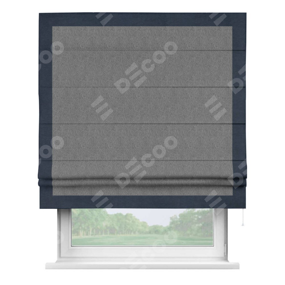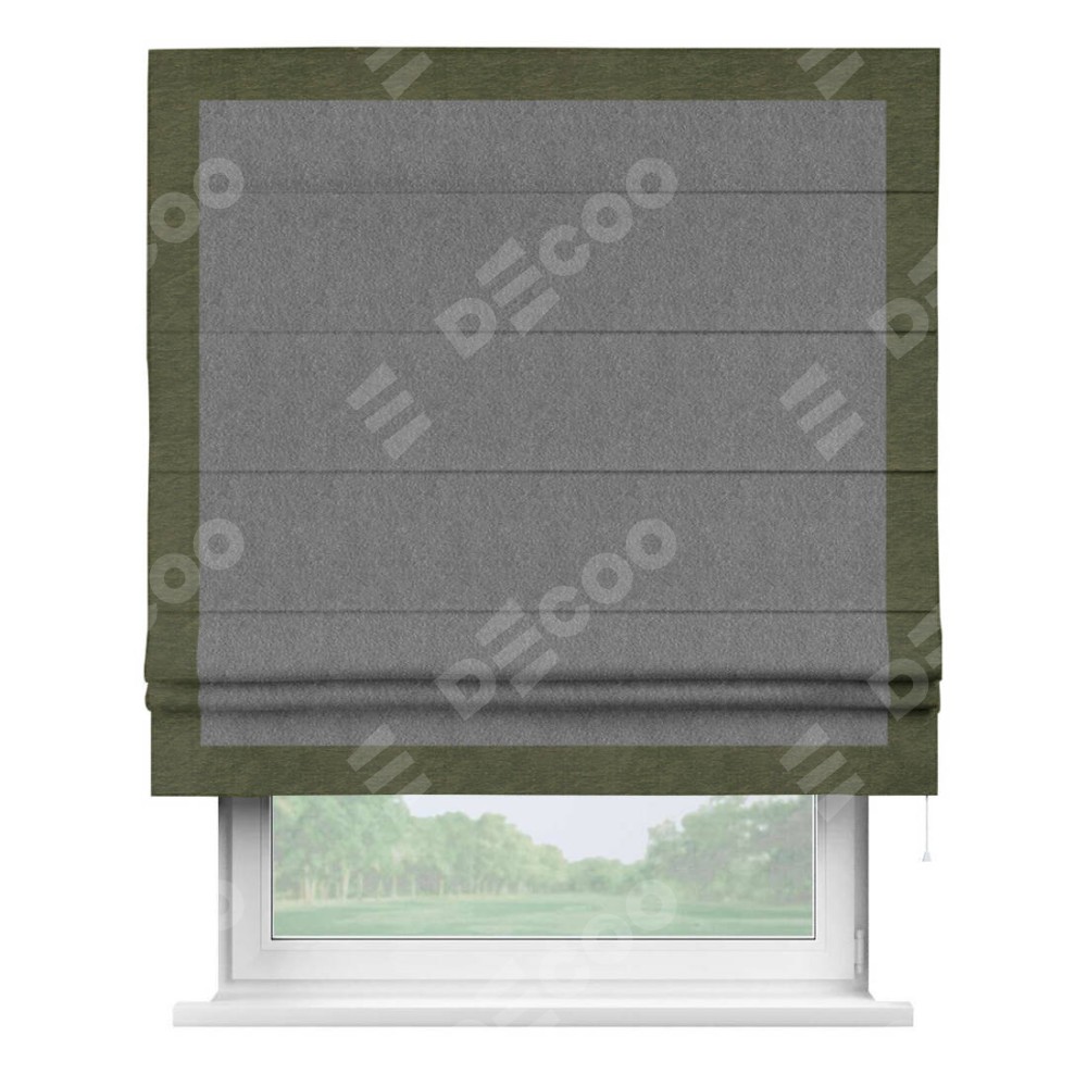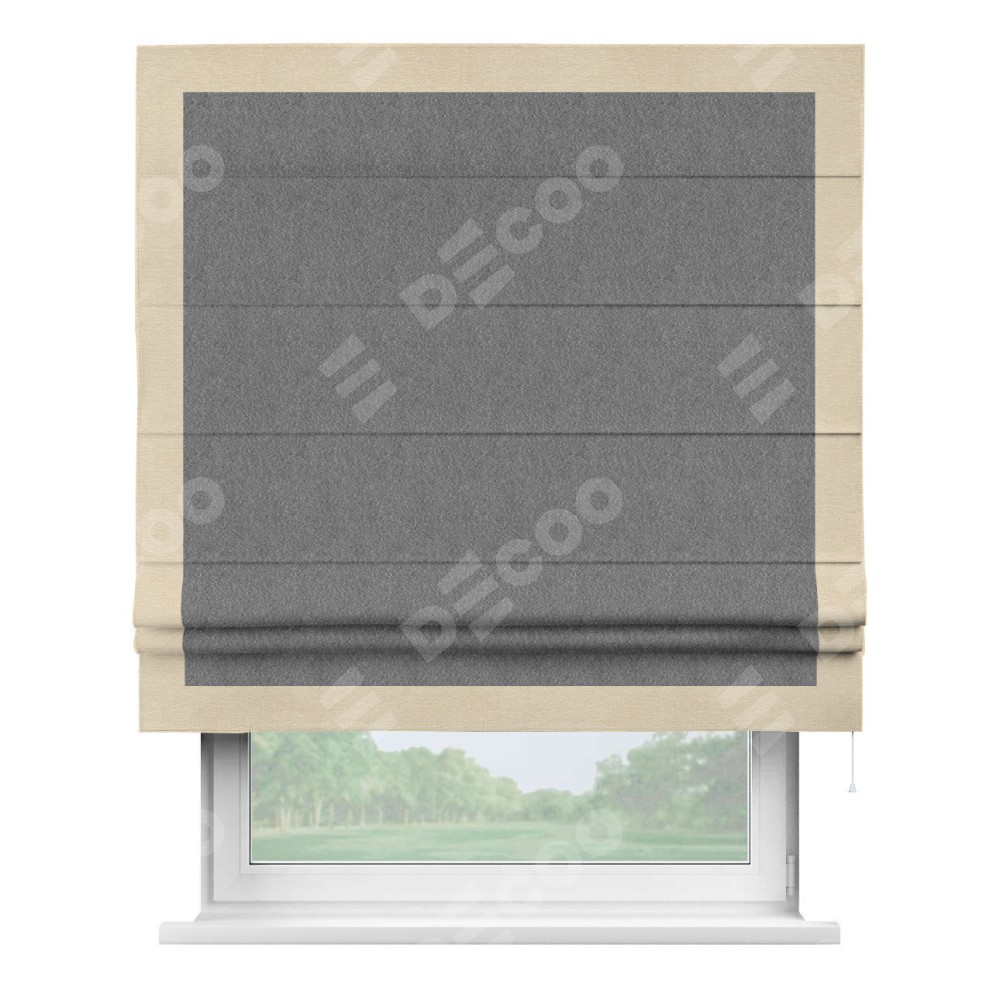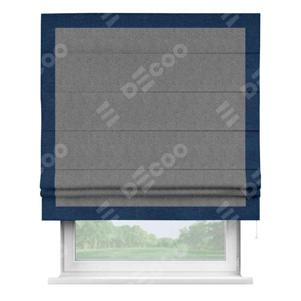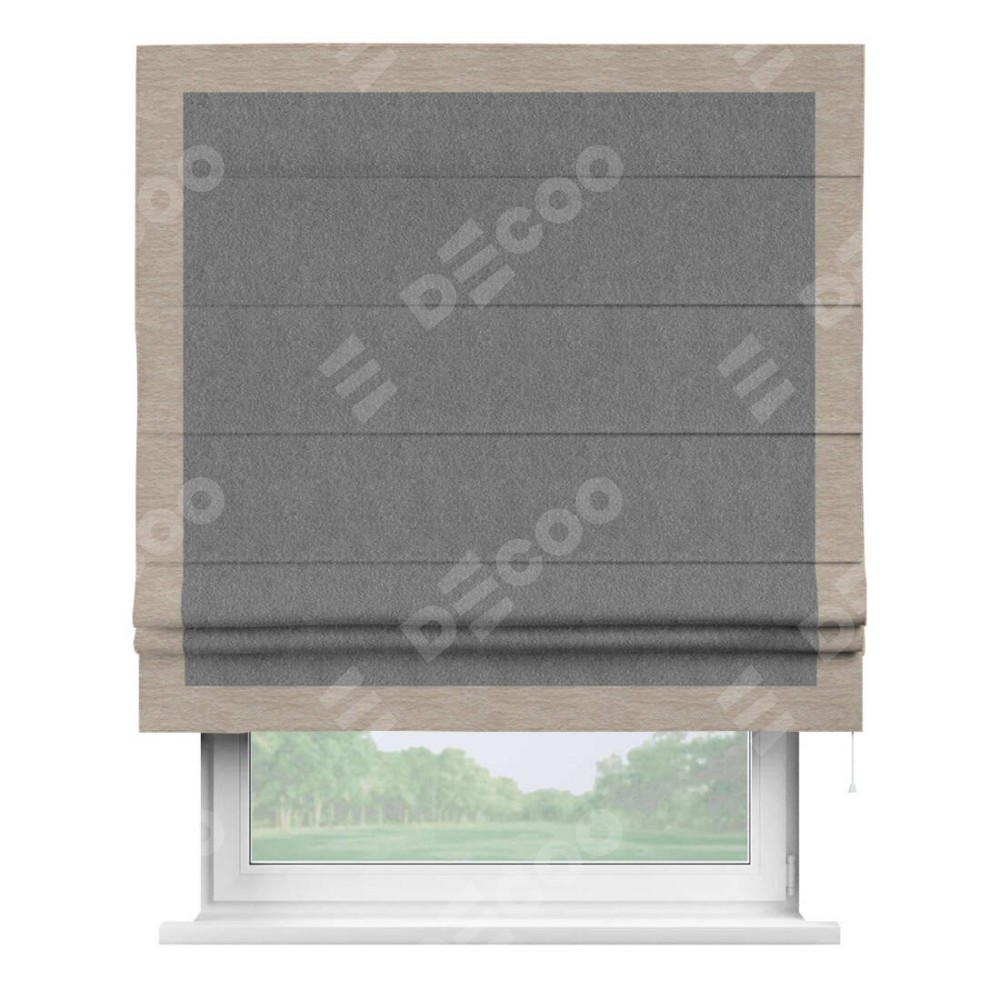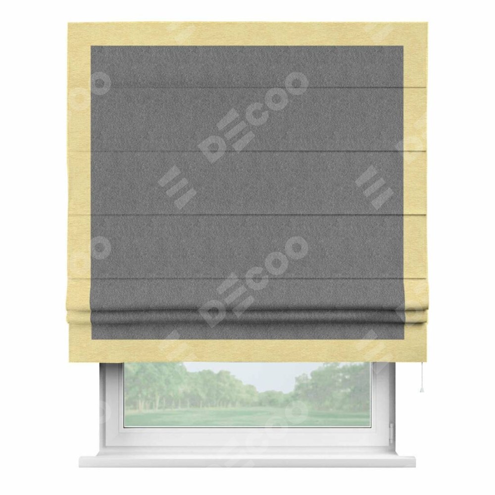 Римская штора производителя «Cortin», используется для проёма, пошита из ткани софт однотонный серый, артикул 70605. Отделка шторы кантом «Чесс», ткань для канта используется из софта разной расцветки на выбор. Имеет универсальный механизм и подходит для монтажа: на потолок, на стену и в нишу.