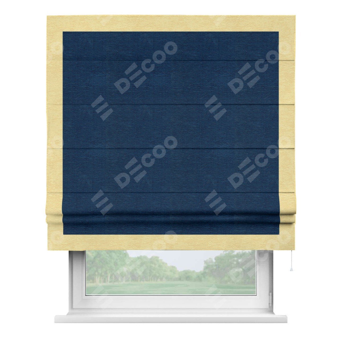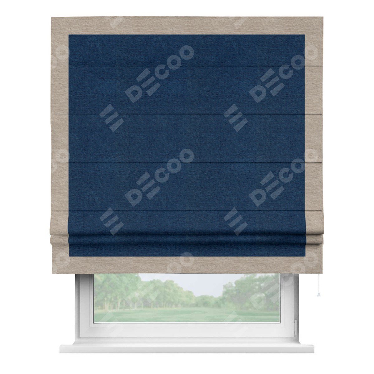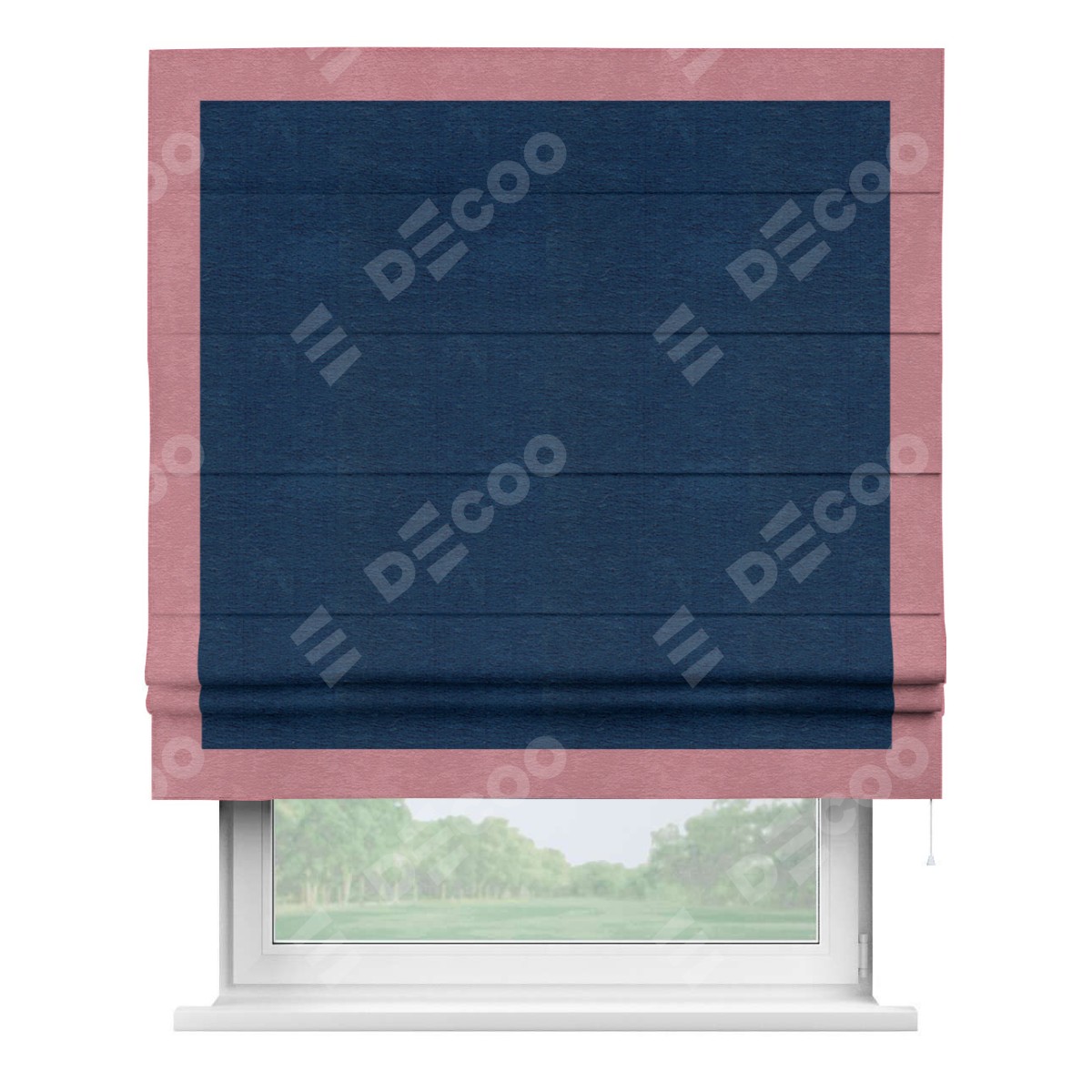 Римская штора производителя «Cortin», используется для проёма, пошита из ткани софт однотонный синий, артикул 42937. Отделка шторы кантом «Чесс», ткань для канта используется из софта разной расцветки на выбор. Имеет универсальный механизм и подходит для монтажа: на потолок, на стену и в нишу.