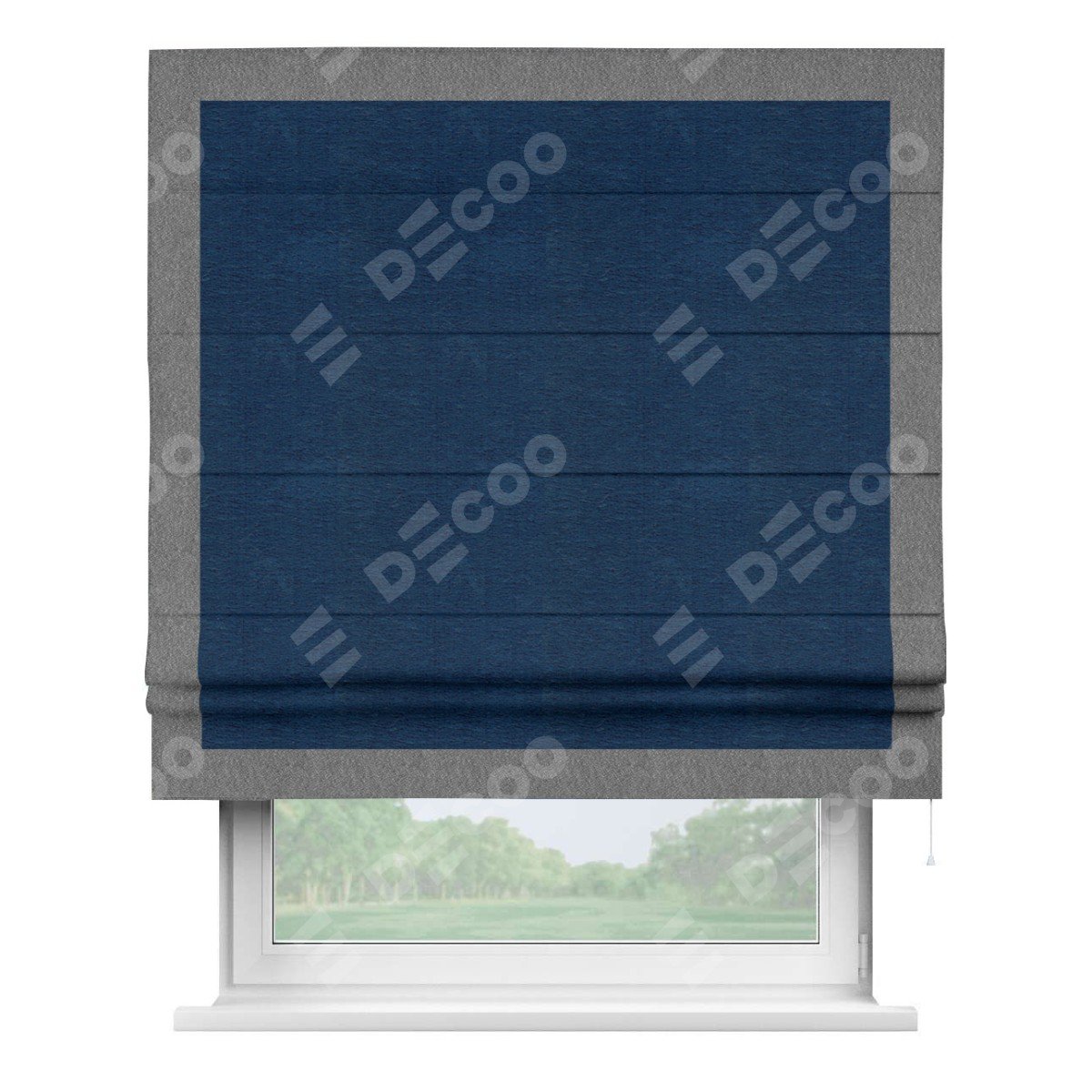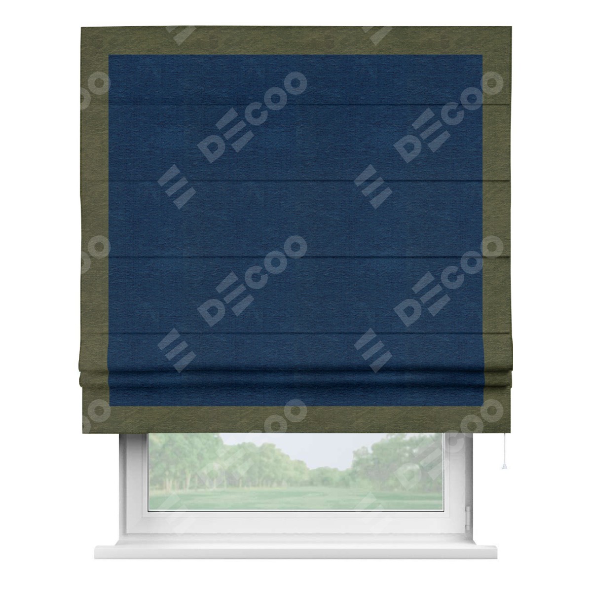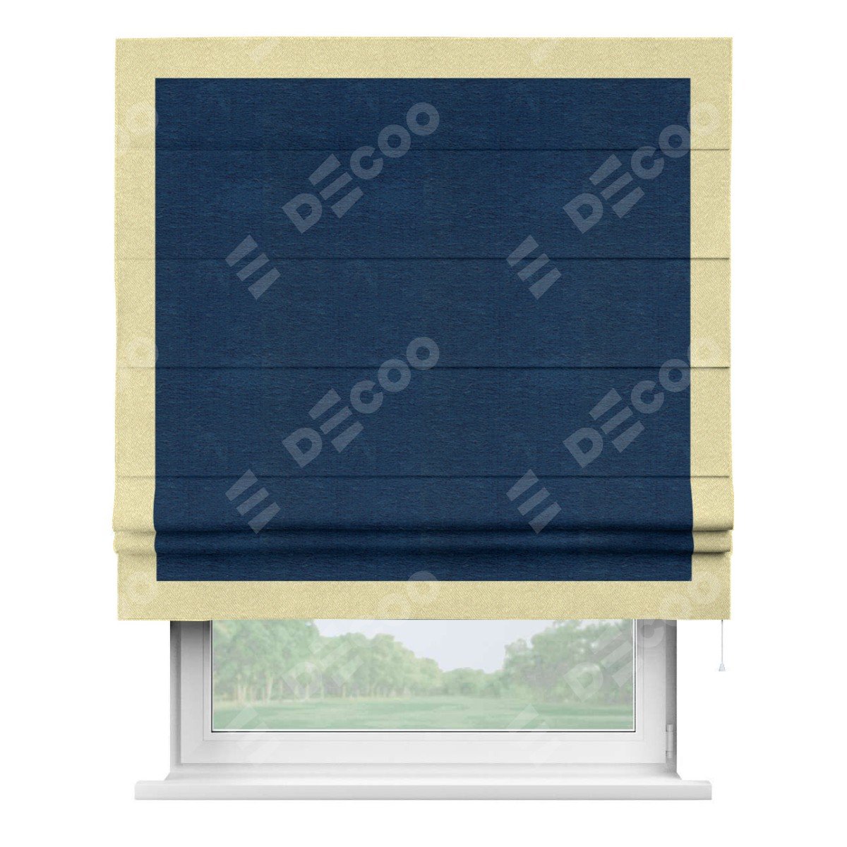 Римская штора производителя «Cortin», используется для проёма, пошита из ткани софт однотонный синий, артикул 42937. Отделка шторы кантом «Чесс», ткань для канта используется из софта разной расцветки на выбор. Имеет универсальный механизм и подходит для монтажа: на потолок, на стену и в нишу.