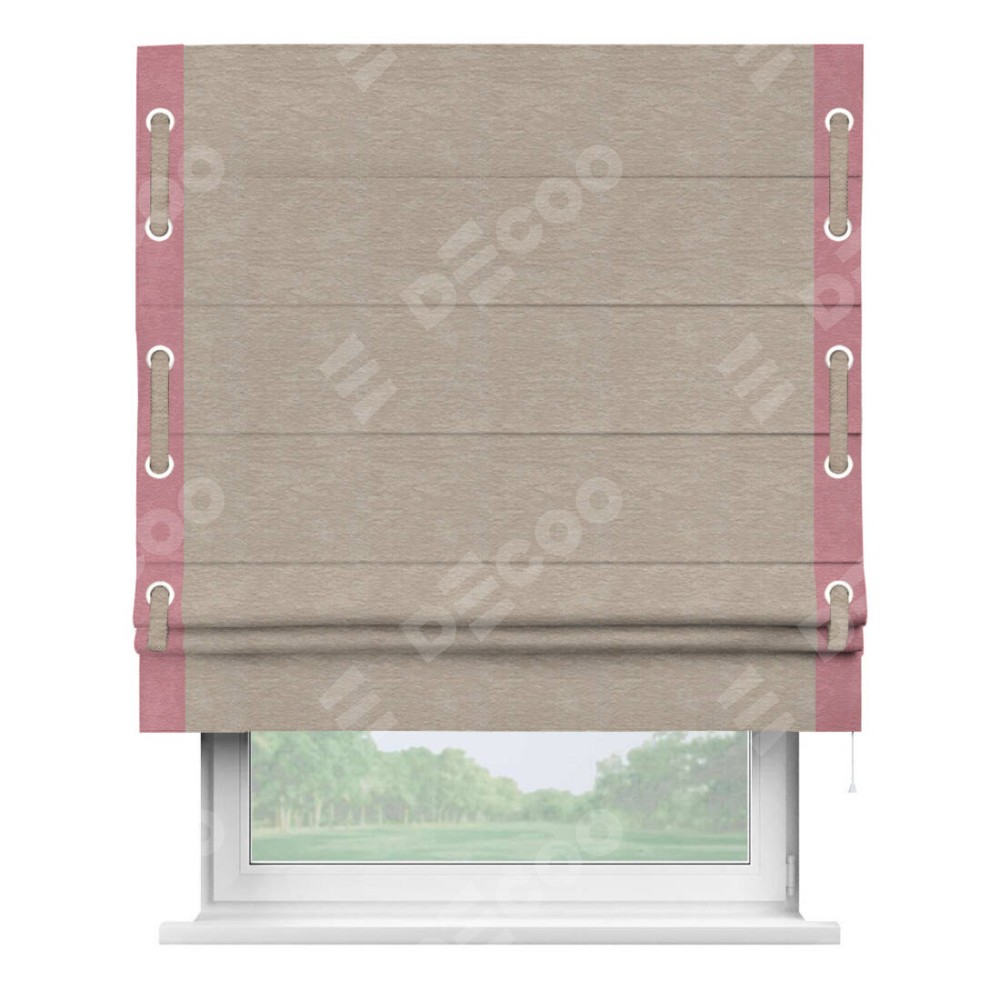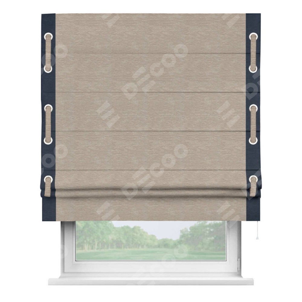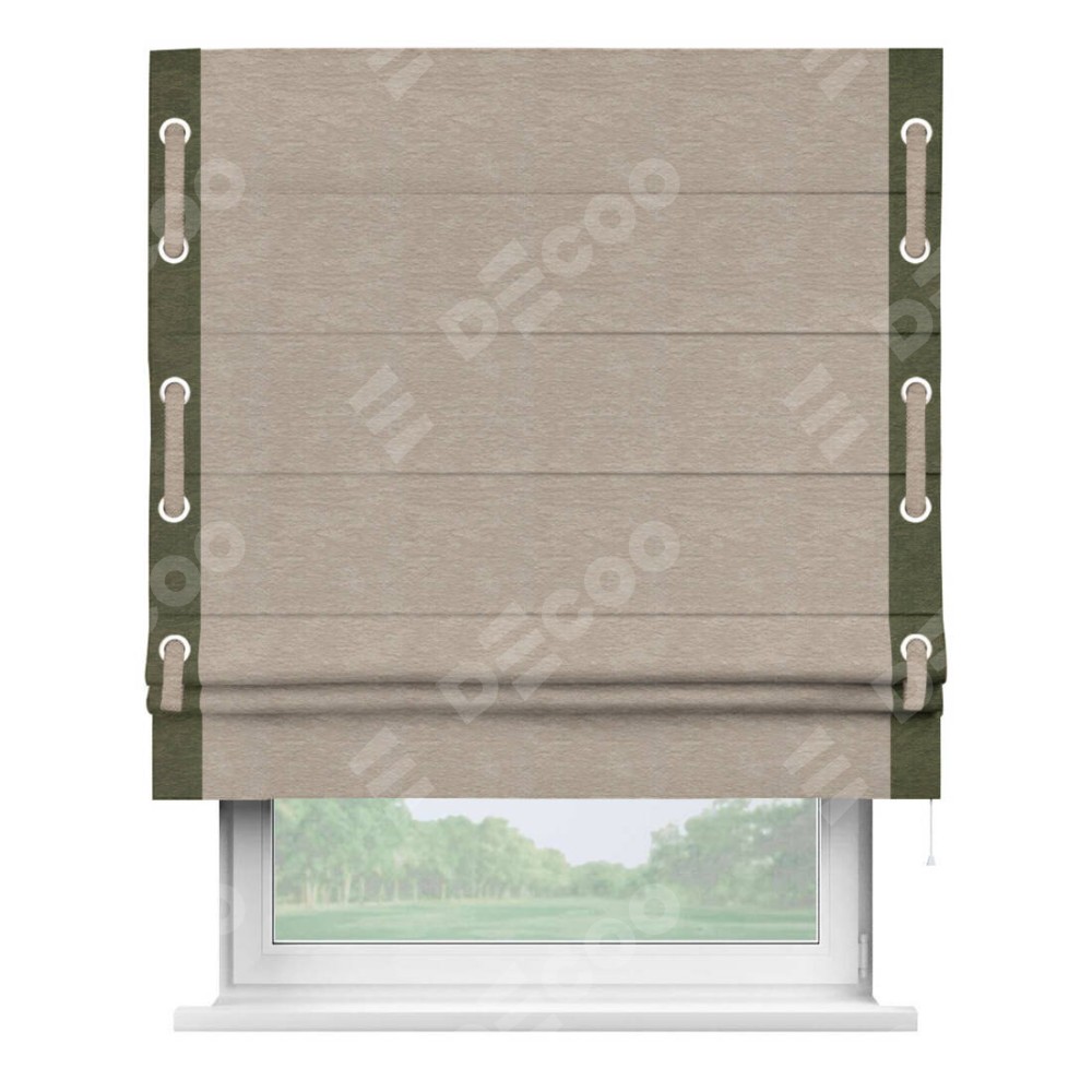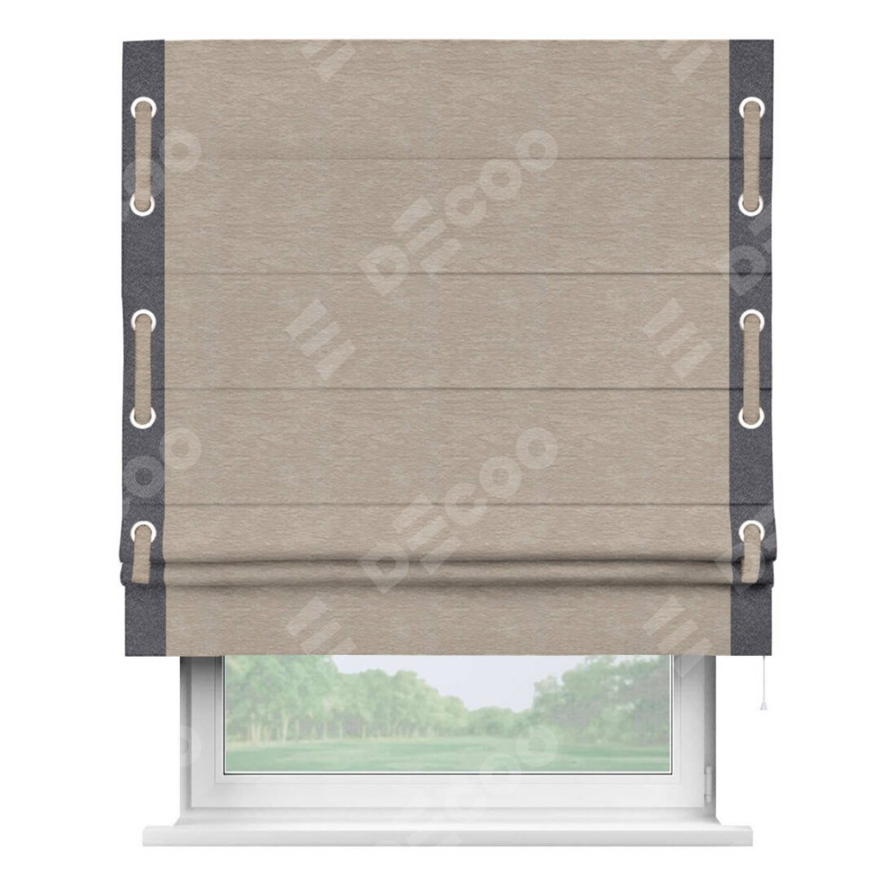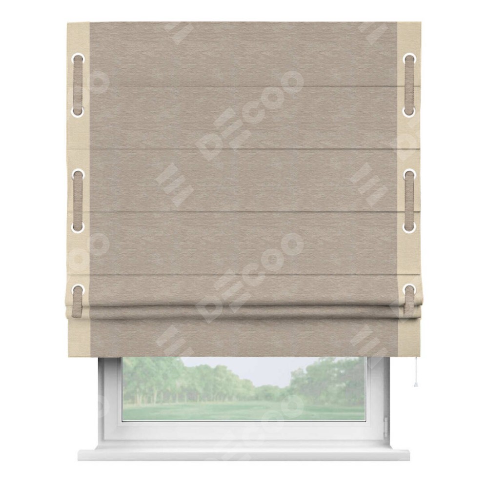 Римская штора производителя «Cortin», используется для проёма, пошита из ткани софт однотонный темно-бежевый, артикул 1640. Отделка шторы кантом «Стрим Дуо» на кантах расположены люверсы с пояском, ткань для канта используется из софта разной расцветки на выбор. Ткань для пояска обычно используется из основной ткани шторы, а так же можно сделать из любой расцветки по желанию. Имеет универсальный механизм и подходит для монтажа: на потолок, на стену и в нишу.