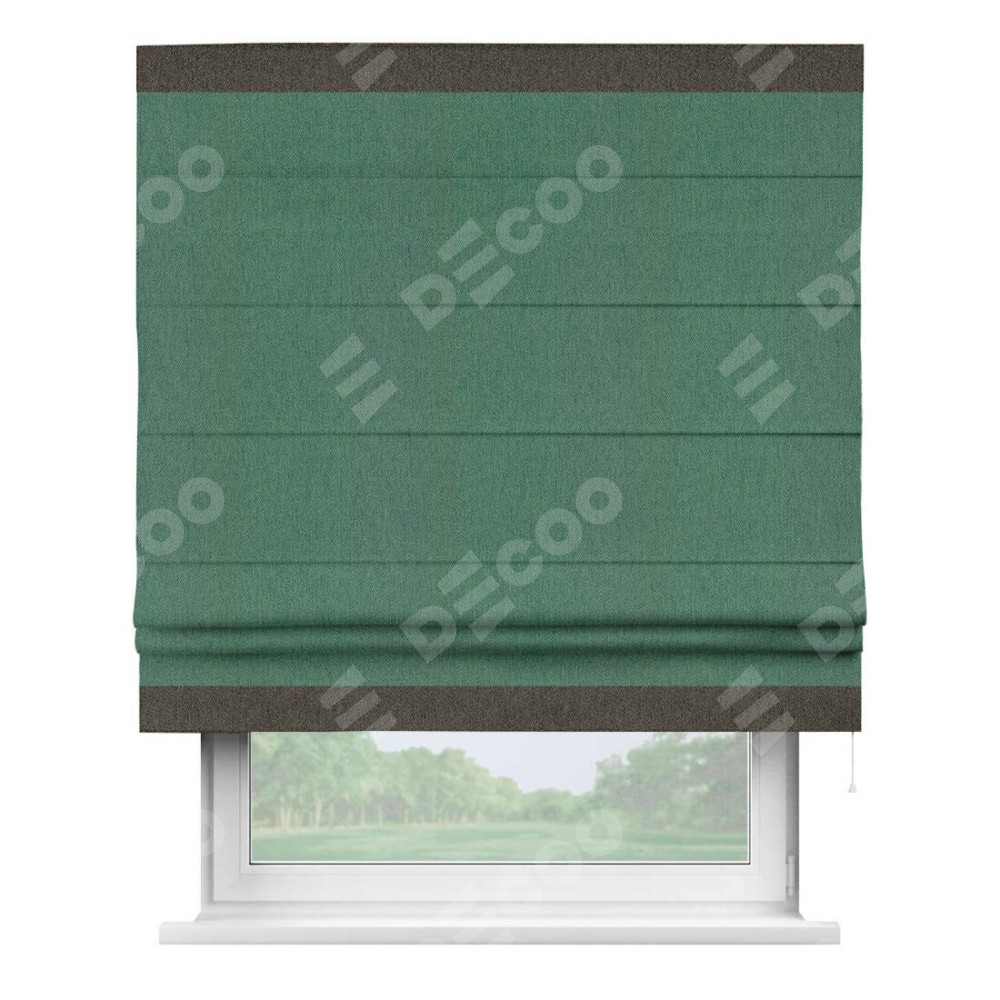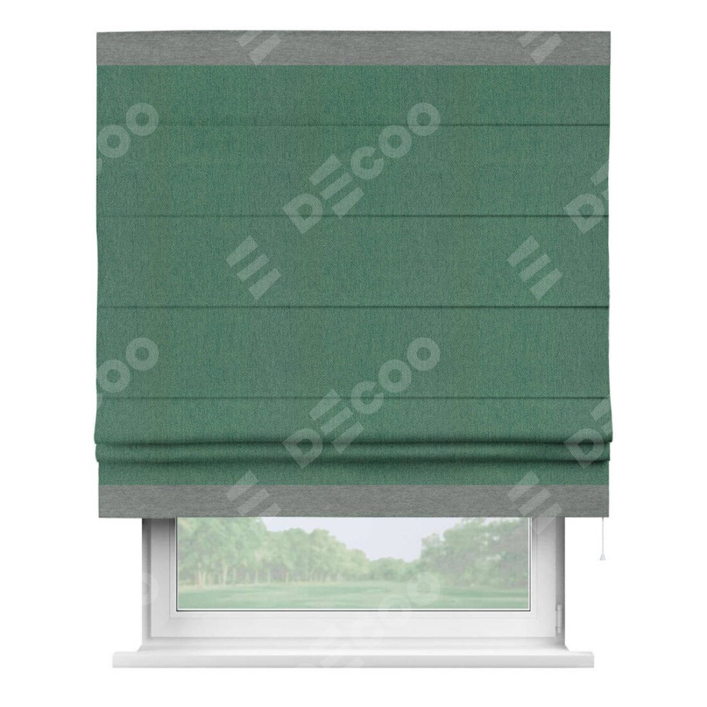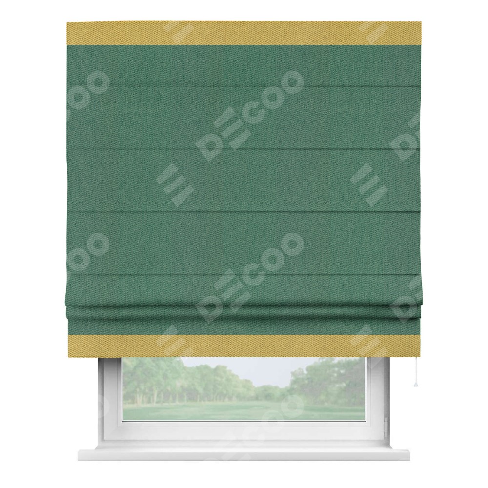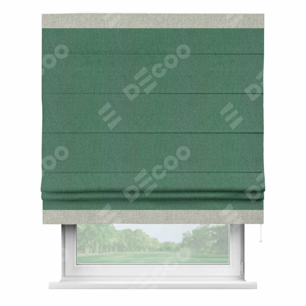Римская штора производителя «Cortin», используется для проёма, пошита из ткани твид блэкаут зелёный, артикул 21589. Отделка шторы кантом «Горизонт», ткань для канта используется из твида разной расцветки на выбор. Имеет универсальный механизм и подходит для монтажа: на потолок, на стену и в нишу.