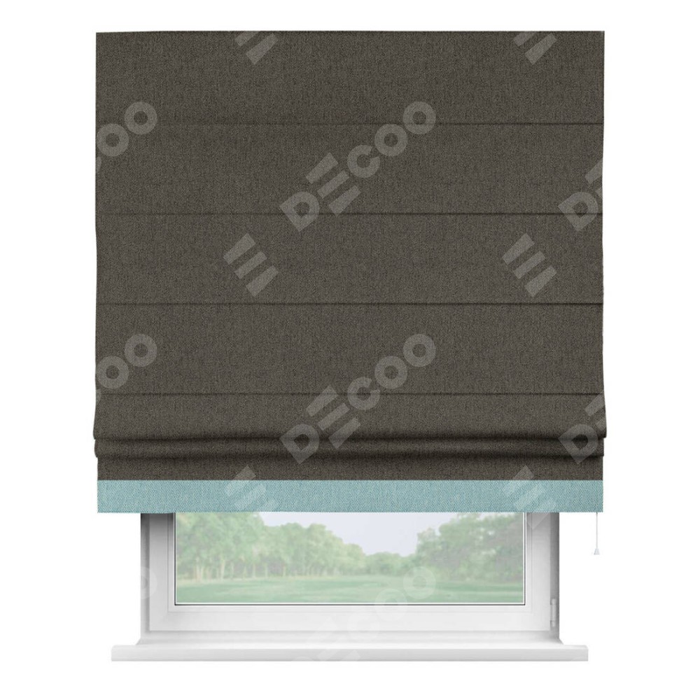 Римская штора производителя «Cortin», используется для проёма, пошита из ткани твид блэкаут тёмно-коричневый, артикул 21584. Отделка шторы кантом «Джестер», ткань для канта используется из твида разной расцветки на выбор. Имеет универсальный механизм и подходит для монтажа: на потолок, на стену и в нишу.