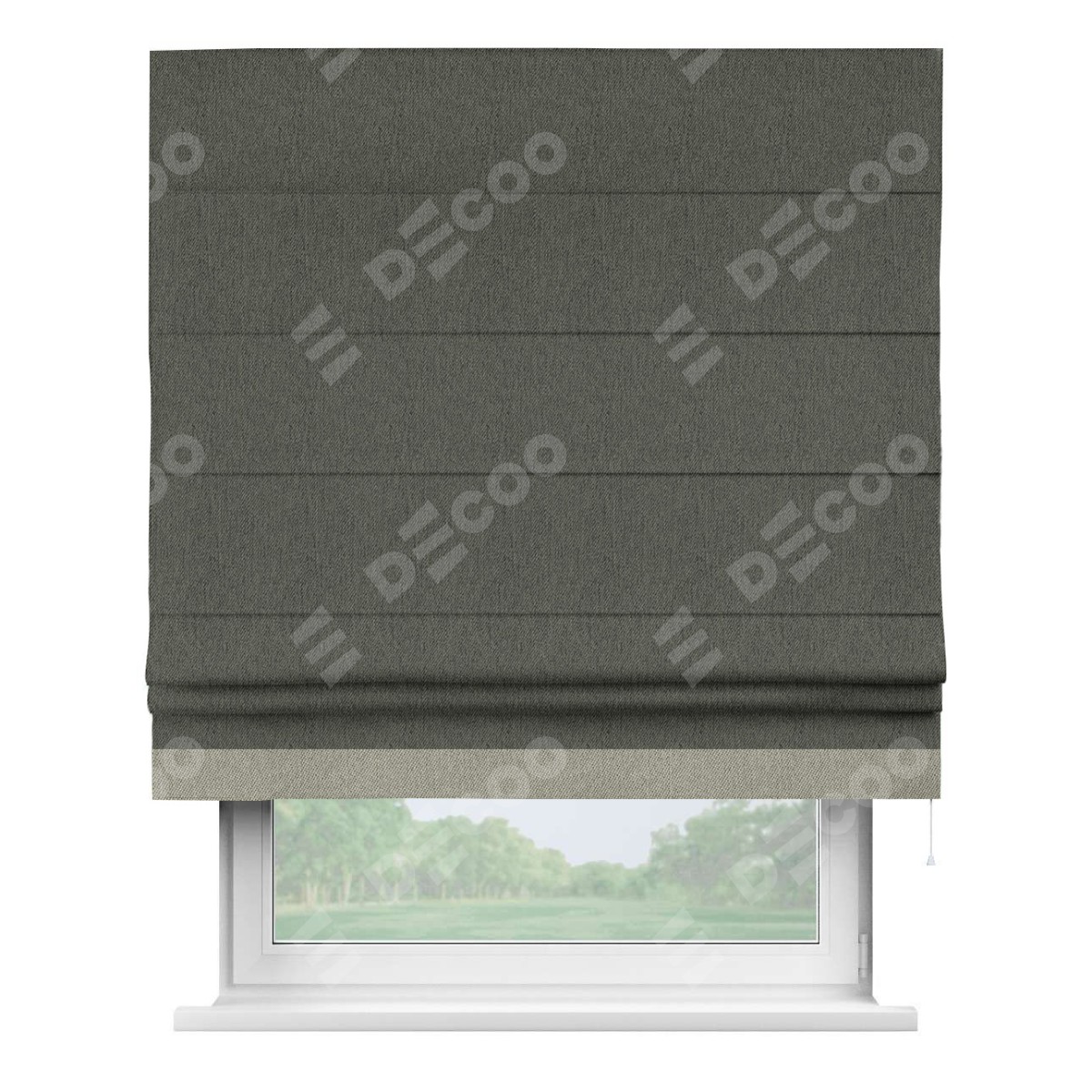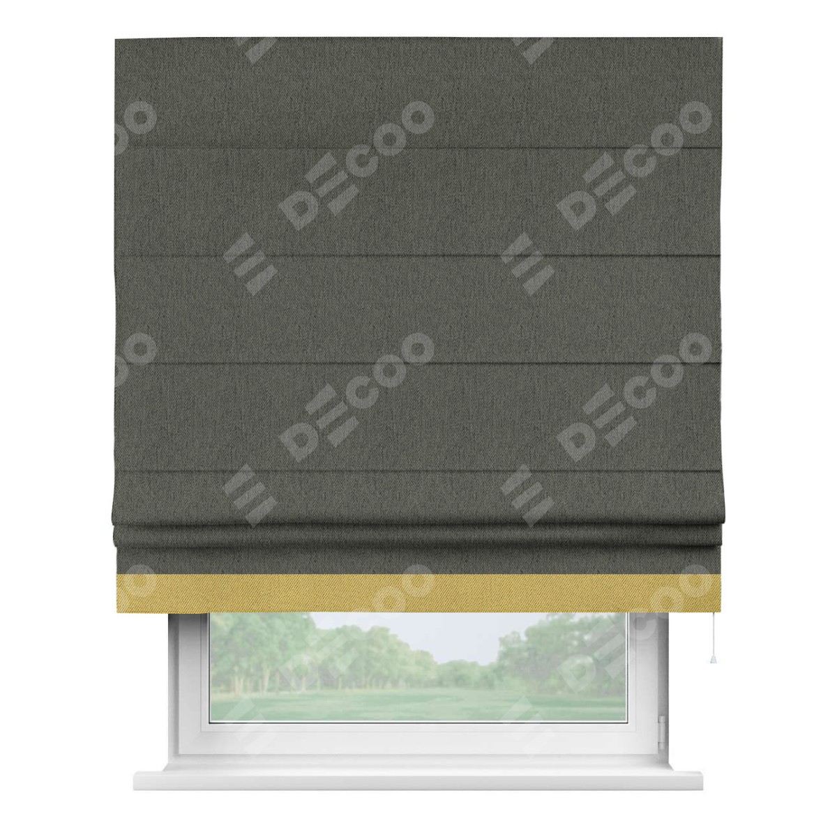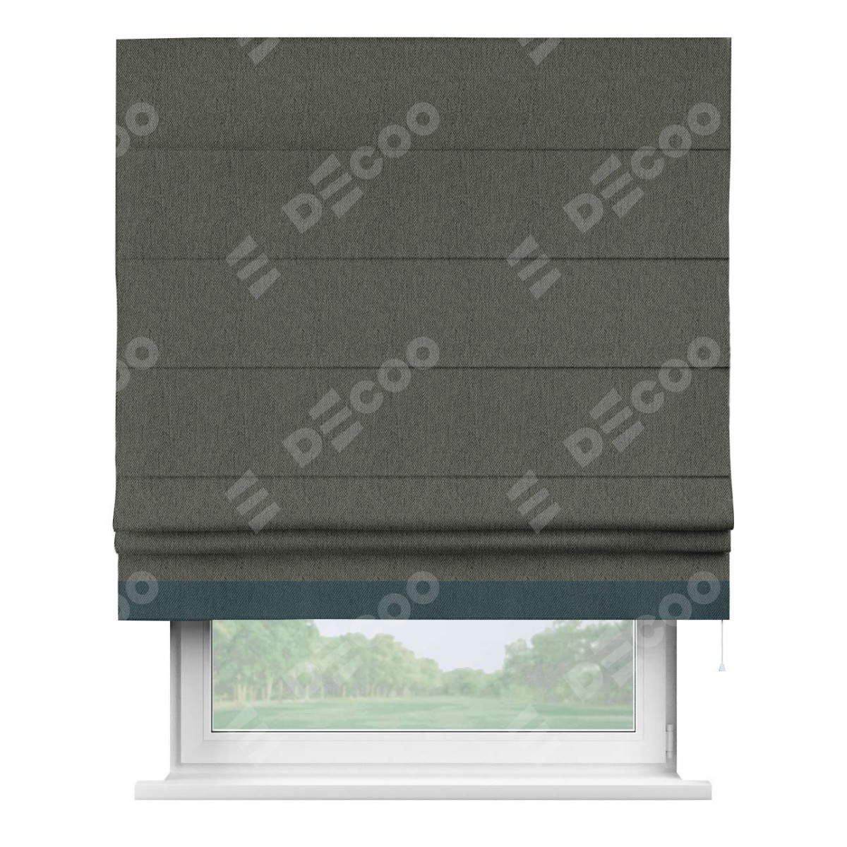Римская штора производителя «Cortin», используется для проёма, пошита из ткани твид блэкаут тёмно-серый, артикул 21587. Отделка шторы кантом «Джестер», ткань для канта используется из твида разной расцветки на выбор. Имеет универсальный механизм и подходит для монтажа: на потолок, на стену и в нишу.
