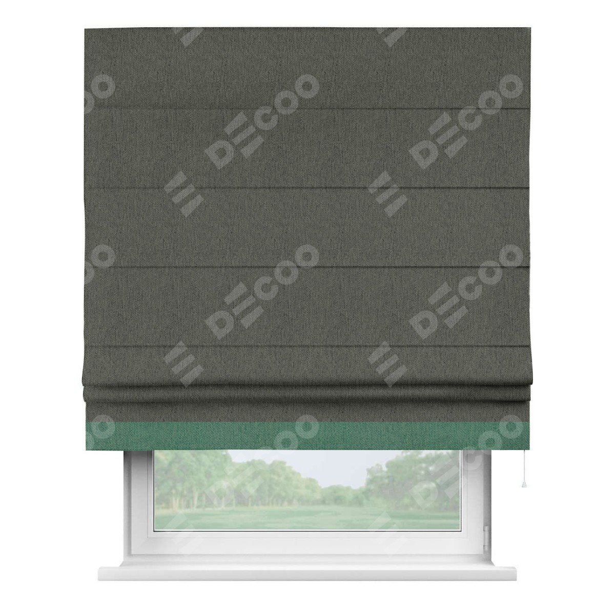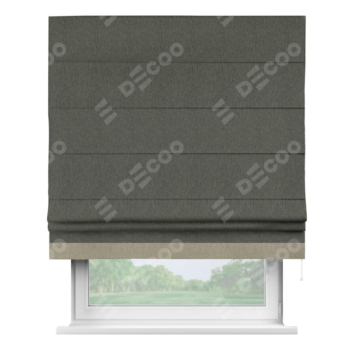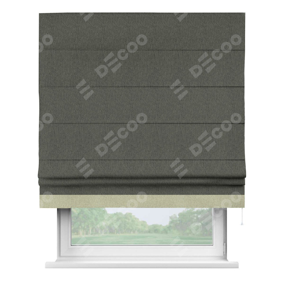 Римская штора производителя «Cortin», используется для проёма, пошита из ткани твид блэкаут тёмно-серый, артикул 21587. Отделка шторы кантом «Джестер», ткань для канта используется из твида разной расцветки на выбор. Имеет универсальный механизм и подходит для монтажа: на потолок, на стену и в нишу.