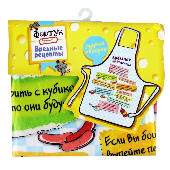 Чтобы на вашей кухне всегда царило позитивное настроение во время готовки, непременно наденьте фартук полноцветный «Вредные рецепты». Его эксклюзивный принт сделает приготовление блюд нескучным, а средняя длина защитит вашу одежду от пятен. Благодаря выбранному материалу фартук дополнит ваш образ изысканностью и стилем!