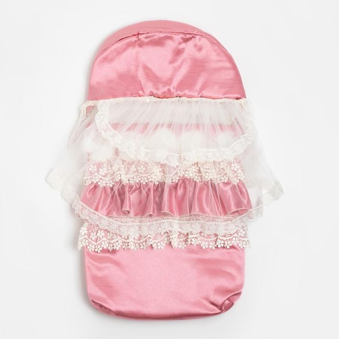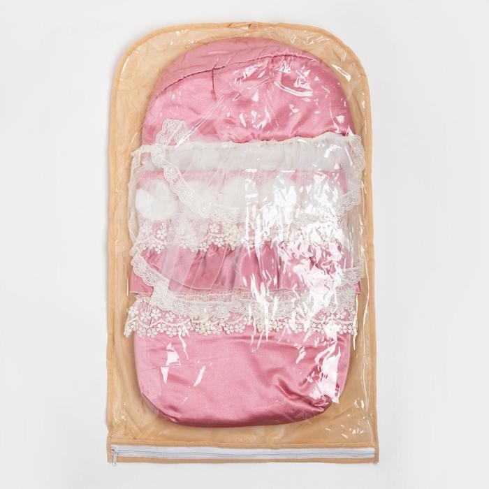 Конверт на двух боковых молниях выполнен из тонкого атласа с мягким шелковистым отливом. Есть съёмная вуаль. Подойдёт на выписку из родильного дома для прогулки.